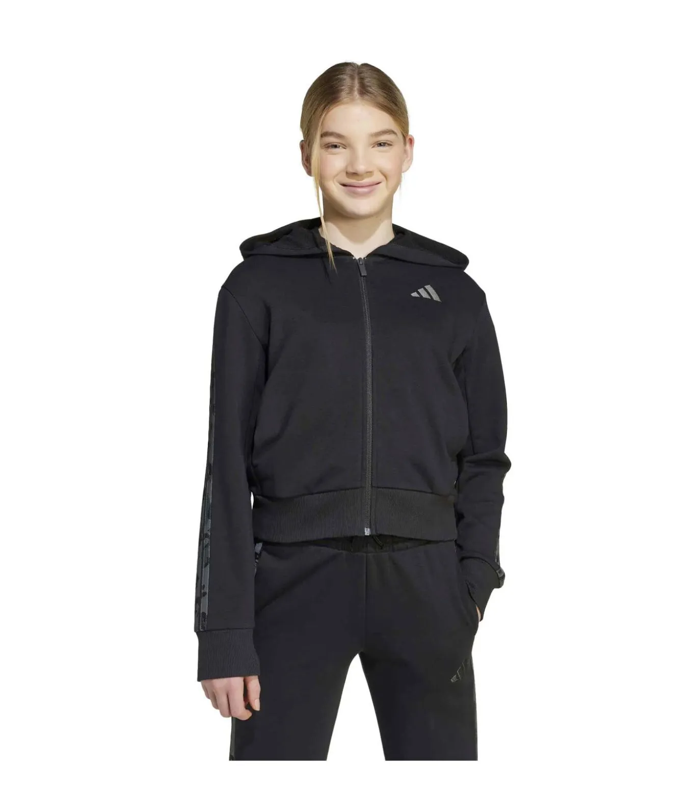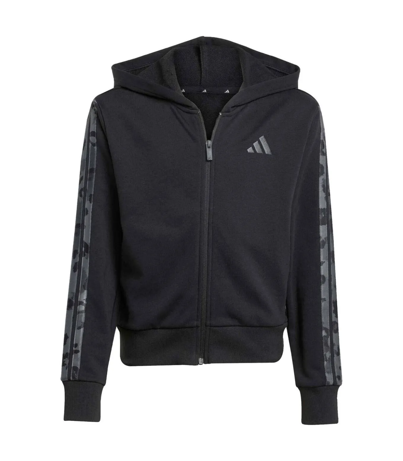 Kleur: zwart. Samenstelling: 55% katoen, 36% gerecycled polyester, 9% viscose. Mouwen: lang. Halslijn: capuchon. Pasvorm: regular fit. Sluiting: rits aan de voorkant. Details: French terry stof van katoenmix, 3–strepen met dierenprint voor een speelse touch. Gebruik: juniorjas, ideaal voor school, vrije tijd en dagelijkse activiteiten.