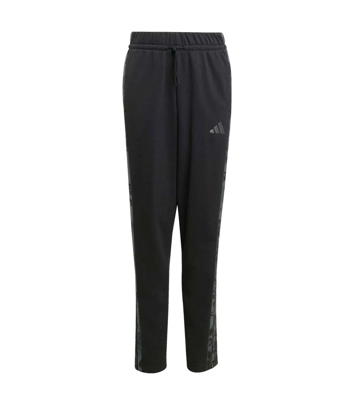 Kleur: Zwart Samenstelling: 55% Katoen, 36% Gerecycled Polyester, 9% Viscose Pasvorm: Regular Fit Sluiting: Elastische taille Details: French Terry fleece stof, 3–Stripes met dierenprint, gemakkelijk aan te trekken ontwerp voor een comfortabele pasvorm Gebruik: Junior broek ideaal voor school, spelen en dagelijkse activiteiten