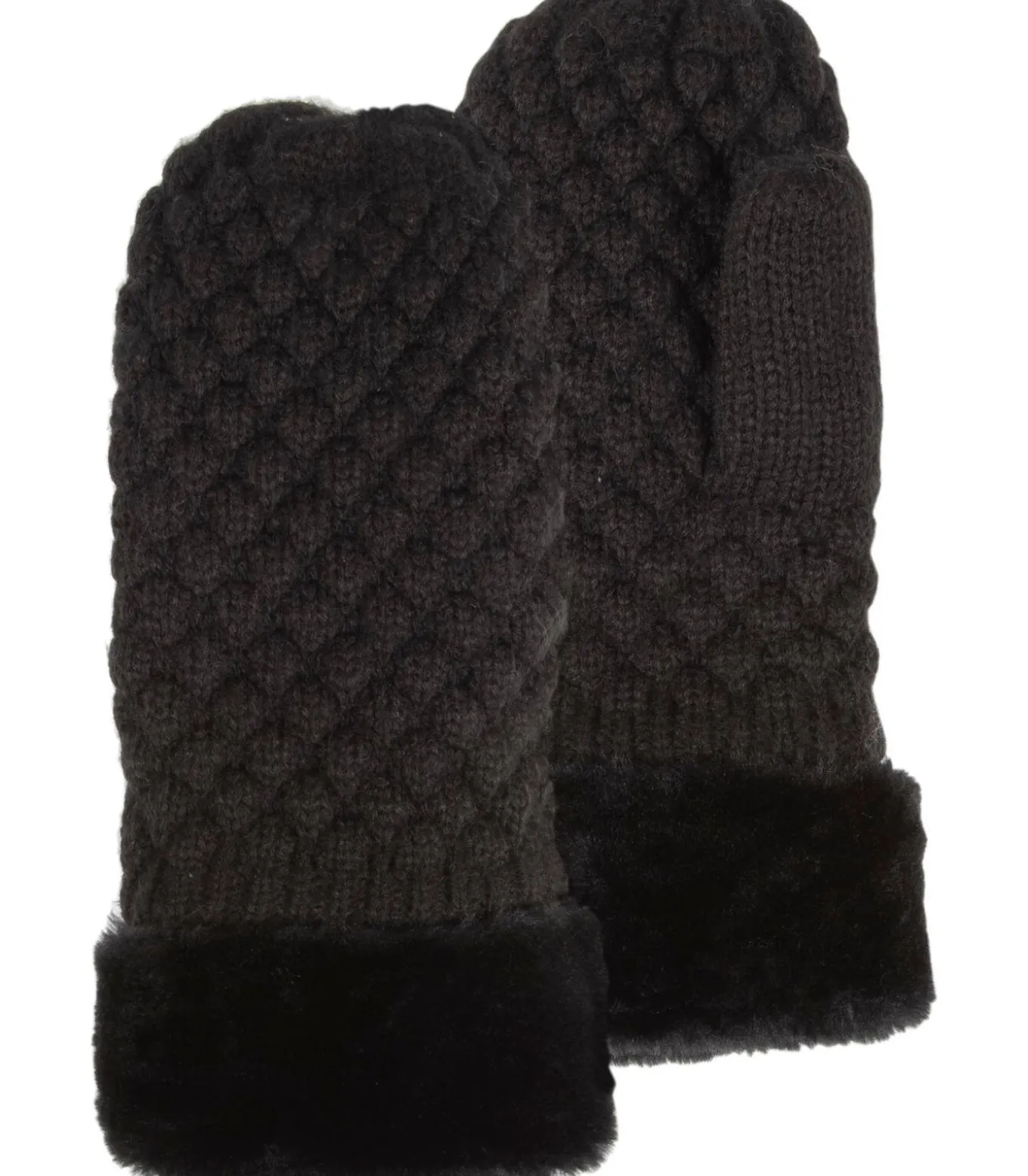 Deze zwarte gebreide wanten hebben een bontrand. Deze wanten zijn gevoerd met imitatiebont om je handen de hele winter warm te houden. One size fits all, deze dameswanten passen zich aan de vorm van je hand aan.