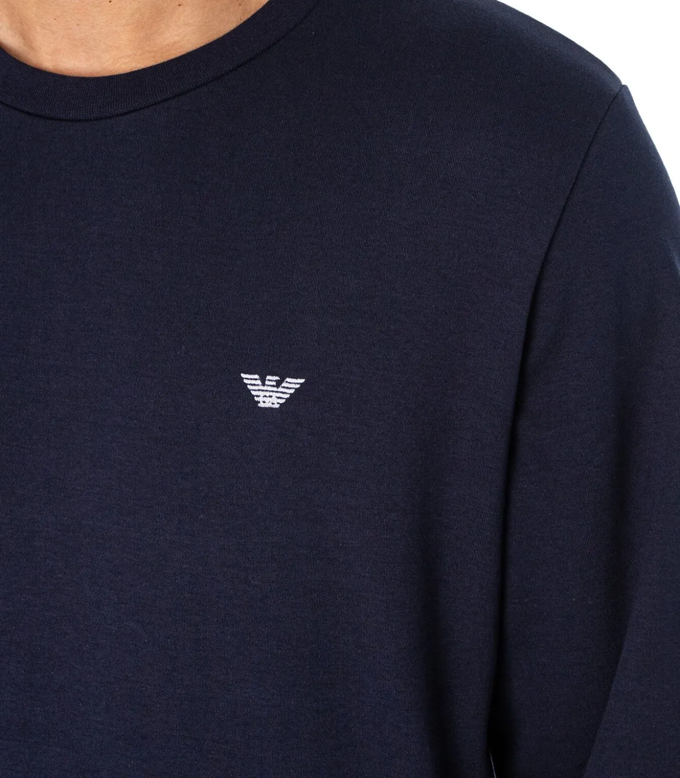 De Emporio Armani gebreide pyjamaset met lange mouwen in marineblauw is het toonbeeld van luxe loungewear. De top heeft een geborduurd logo op de borst met elastische manchetten en zoom, terwijl de broek een taille met trekkoord en open zakken heeft voor een ontspannen en comfortabele pasvorm.