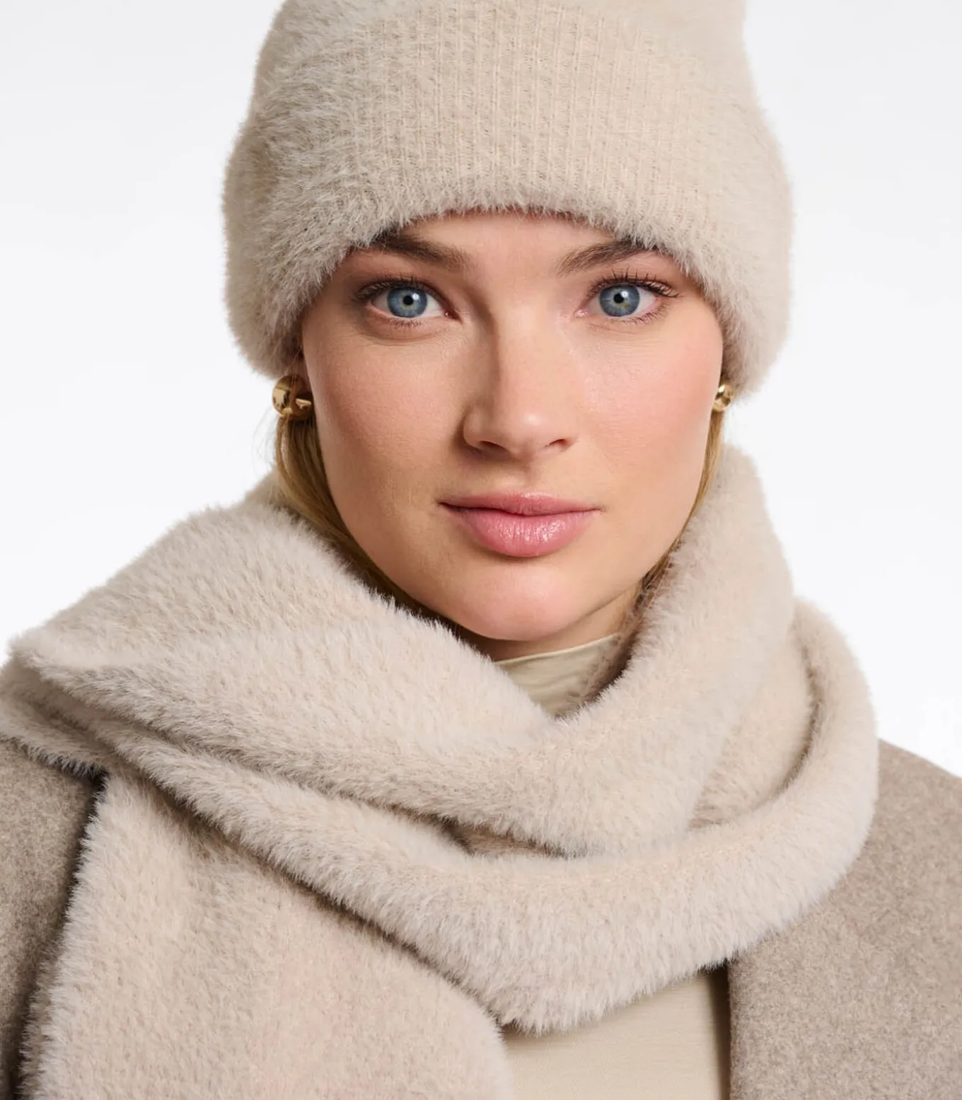 Hul jezelf in de ongeëvenaarde zachtheid van de Nadine beanie, gemaakt van ons unieke luxe materiaal. Deze beanie, aangeboden in een selectie van prachtige effen kleuren, belooft uitzonderlijk comfort tegen je huid. Voor een perfect gecoördineerd en stijlvol ensemble maak je je look compleet met onze bijpassende sjaal.