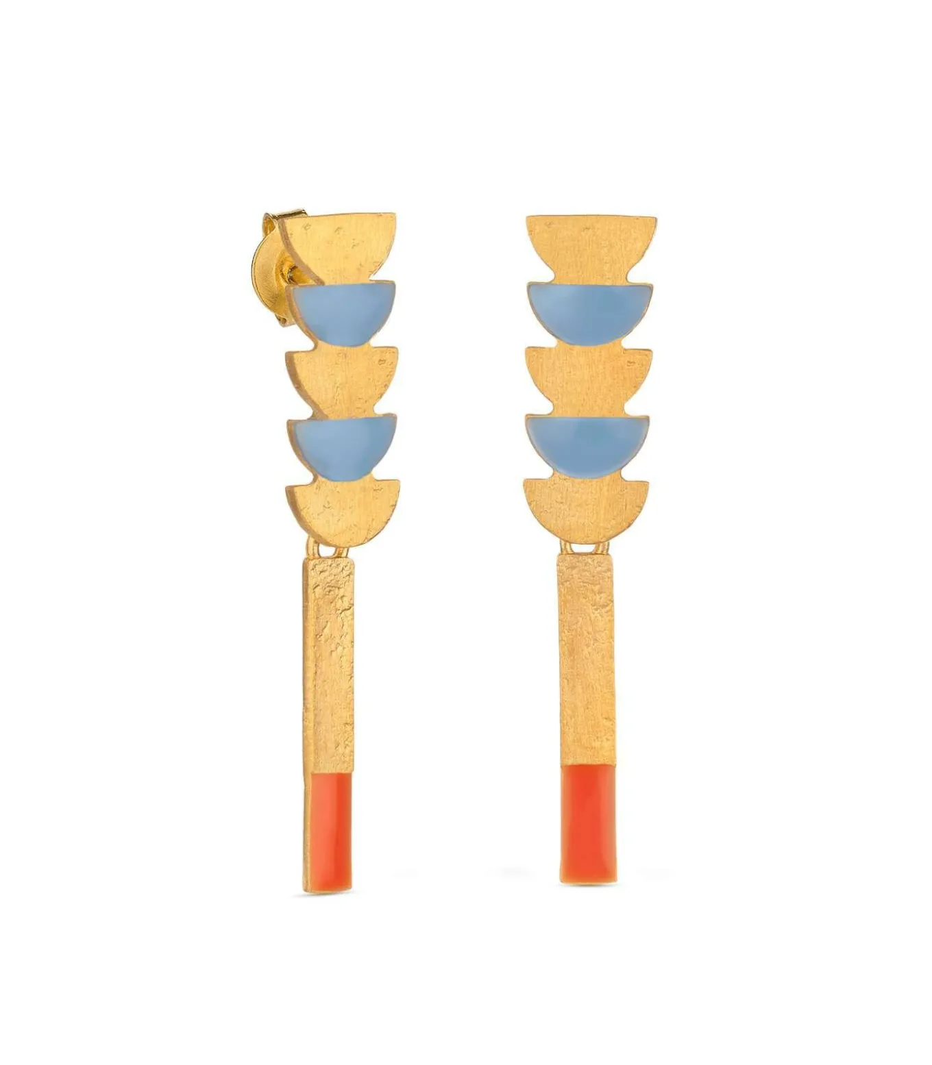Lange geometrische, vergulde oorbellen die intense kleuren en verschillende vormen combineren en zo zowel dynamiek als sereniteit oproepen. In mat verguld metaal met een 24–karaats gouden laag en koud email. Vlindersluiting.