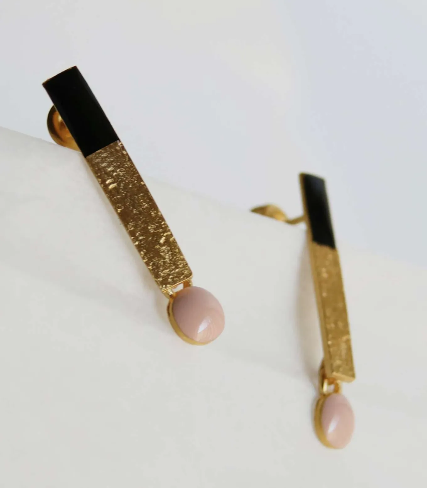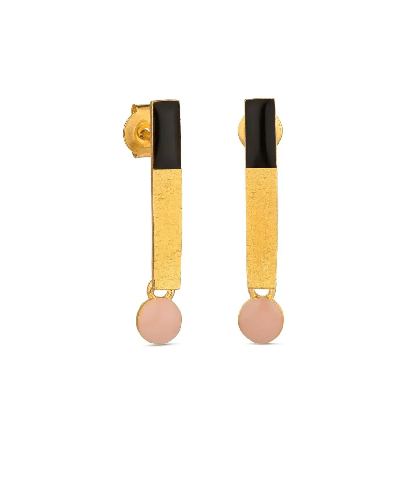 Geometrische, vergulde oorbellen die intense kleuren en verschillende vormen combineren en zo zowel dynamiek als sereniteit oproepen. In mat verguld metaal met een 24–karaats gouden laag en koud email. Vlindersluiting.