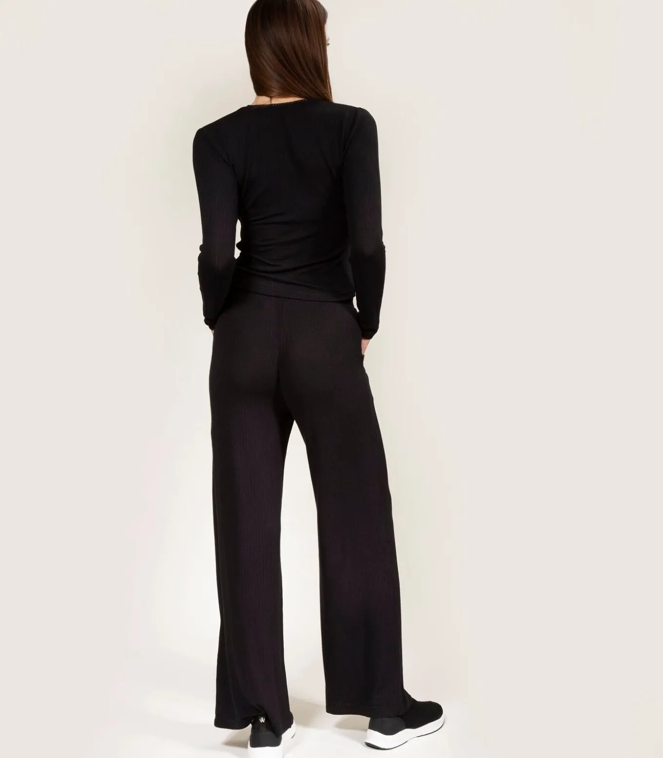 De nieuwe ultrazachte homewear–lijn van Isotoner is grotendeels gemaakt van ECOVERO™ viscose. Dit zwarte ribgebreide wikkeltruitje is een must–have voor de casual chique garderobe. Het model is 177 cm lang en draagt maat 34/36.