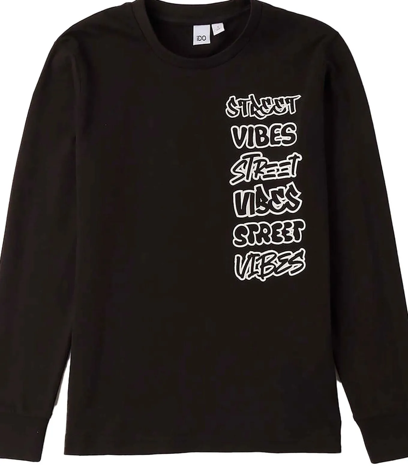 Kleur: Zwart Samenstelling: 100% Katoen Mouwen: Lang Halslijn: Ronde hals Details: T–shirt voor jongens van 8–16 jaar van perzikkleurige katoenen jersey, verrijkt met Street Vibes–opdruk op de voorkant voor een urban en modern karakter. Gebruik: Perfect voor casual en streetwear looks, ideaal voor school en vrije tijd.