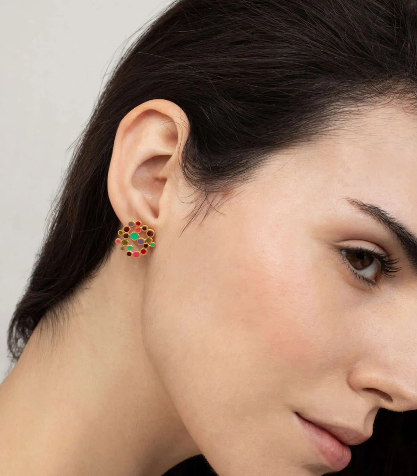 Grote oorbellen, gemaakt van met 24–karaats goud verguld metaal en veelkleurig koud email. Vlindersluiting.