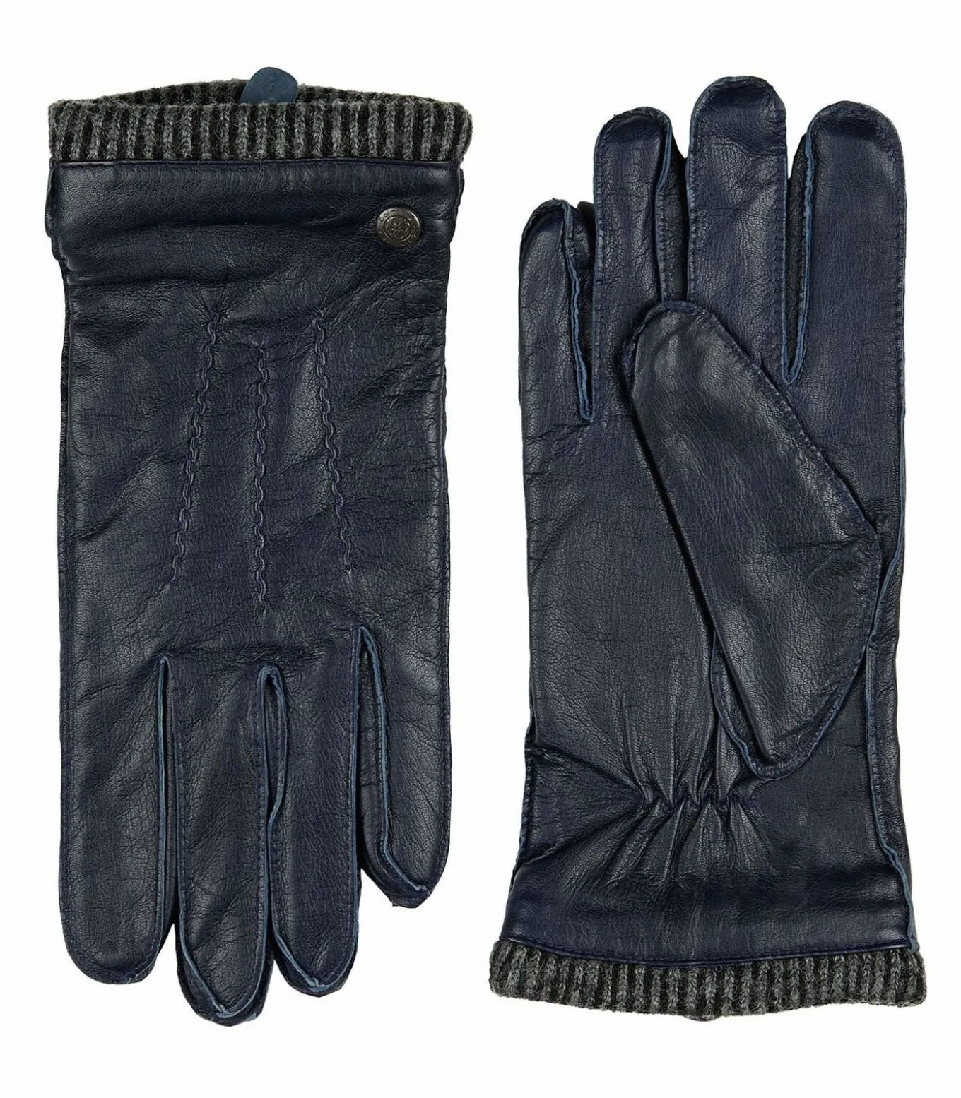 Gevoerde leren handschoenen heren met melange gebreide wollen manchet, model Thornbury. De Laimböck heren handschoenen zijn gevoerd met een zachte wolmix voering.