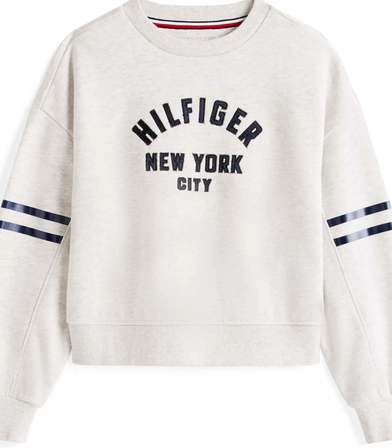 Kleur: Grey Heather. Samenstelling: 68% katoen, 32% gerecycled polyester. Mouwen: lang. Halslijn: ronde hals. Pasvorm: relaxed fit. Details: gestreepte details op de mouwen, geribbelde kraag/manchetten/onderkant, signature tape in de nek, applicatie met Tommy Hilfiger NYC–logo op de voorkant, geborduurde vlag op de mouw. Duurzaamheid: bevat gecertificeerd gerecycled polyester. Gebruik: een must–have in collegestijl, perfect voor casual en comfortabele looks.