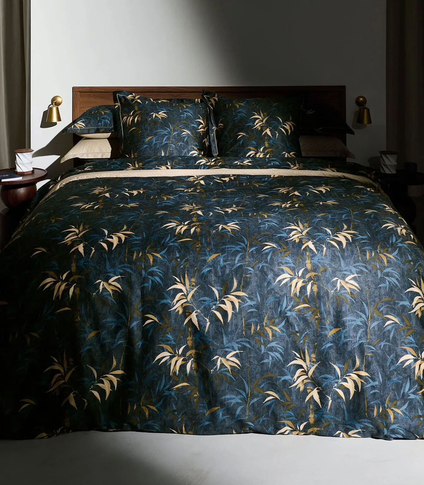 Nachtblauwe palmettenprint op goudbeige achtergrond”