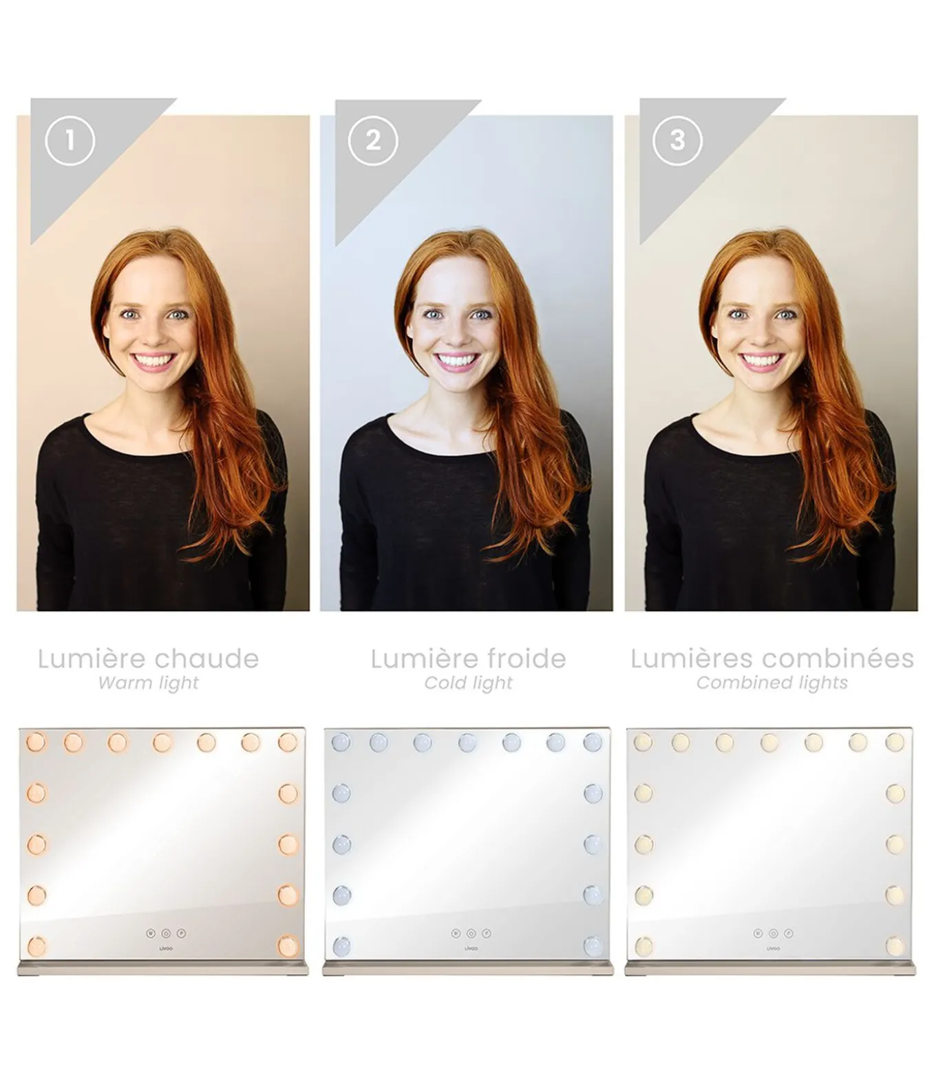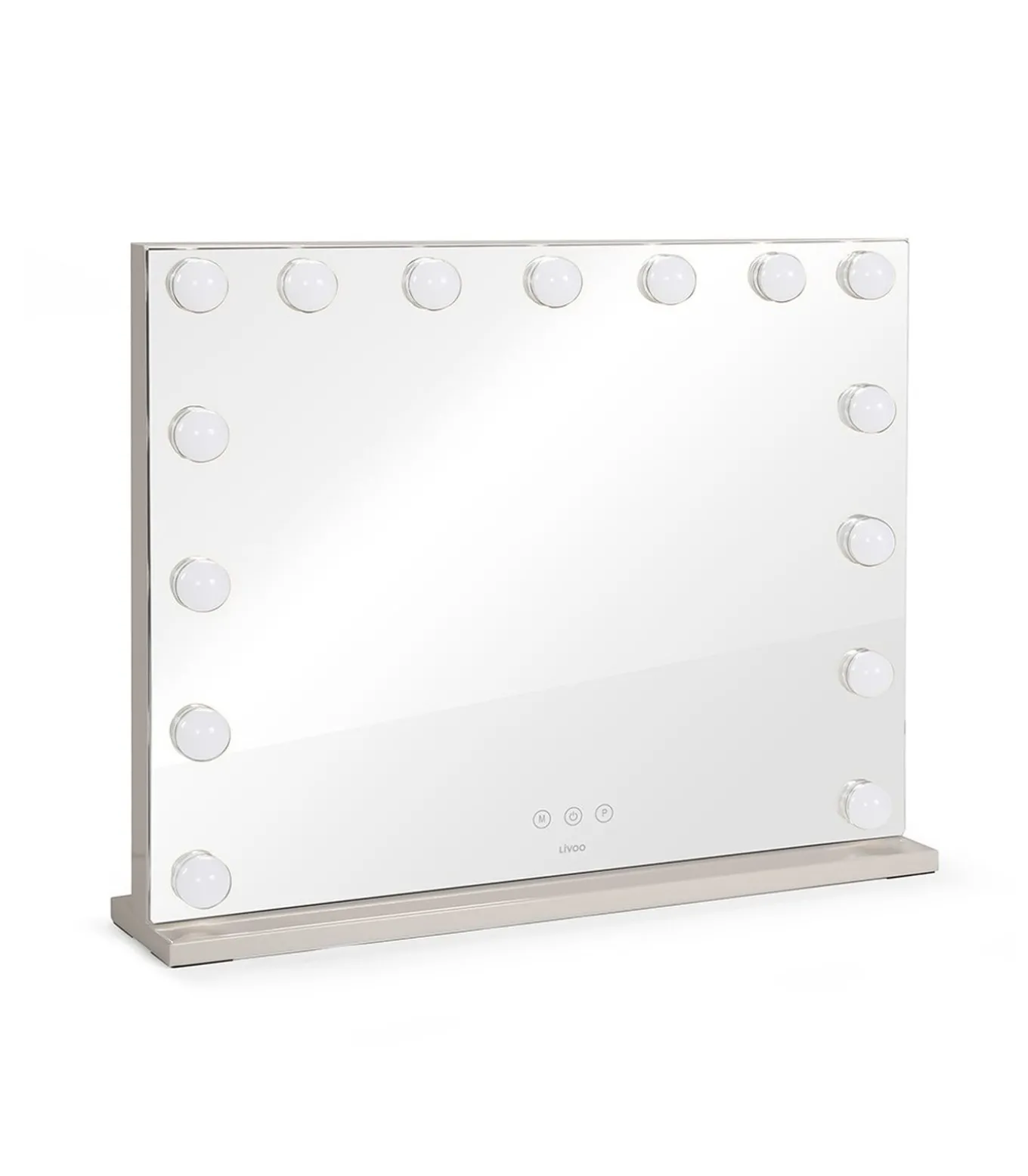 56 x 44 cm spiegel, LED–verlichting met 15 lampen, 3 lichtstanden: warm licht, koel licht, beide gecombineerd, Instelbare lichtintensiteit, Drukknop op spiegel voor verschillende modi, Mogelijkheid om 2 apparaten op te laden via de USB–A poort en de USB–C poort aan de zijkant van de spiegel, Staand op de voet of hangend aan de muur met behulp van de meegeleverde accessoires, Onthoudt de laatst gebruikte modus, Werkt via het meegeleverde stopcontact