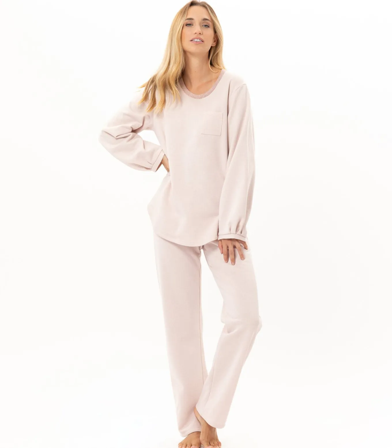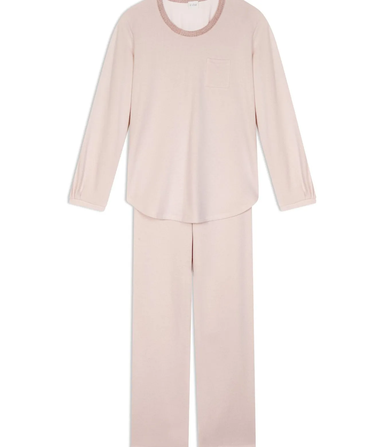 De op een sweatshirt geïnspireerde top en de rechte broek met elastische tailleband creëren een casual maar elegant silhouet voor al je dagelijkse momenten. De perfecte outfit voor op reis of om lekker thuis te zijn. Verkrijgbaar in twee kleuren: diep marineblauw of poederroze, beide voorzien van Lurex®–draden voor een glittereffect.Deze details maken het verschil: