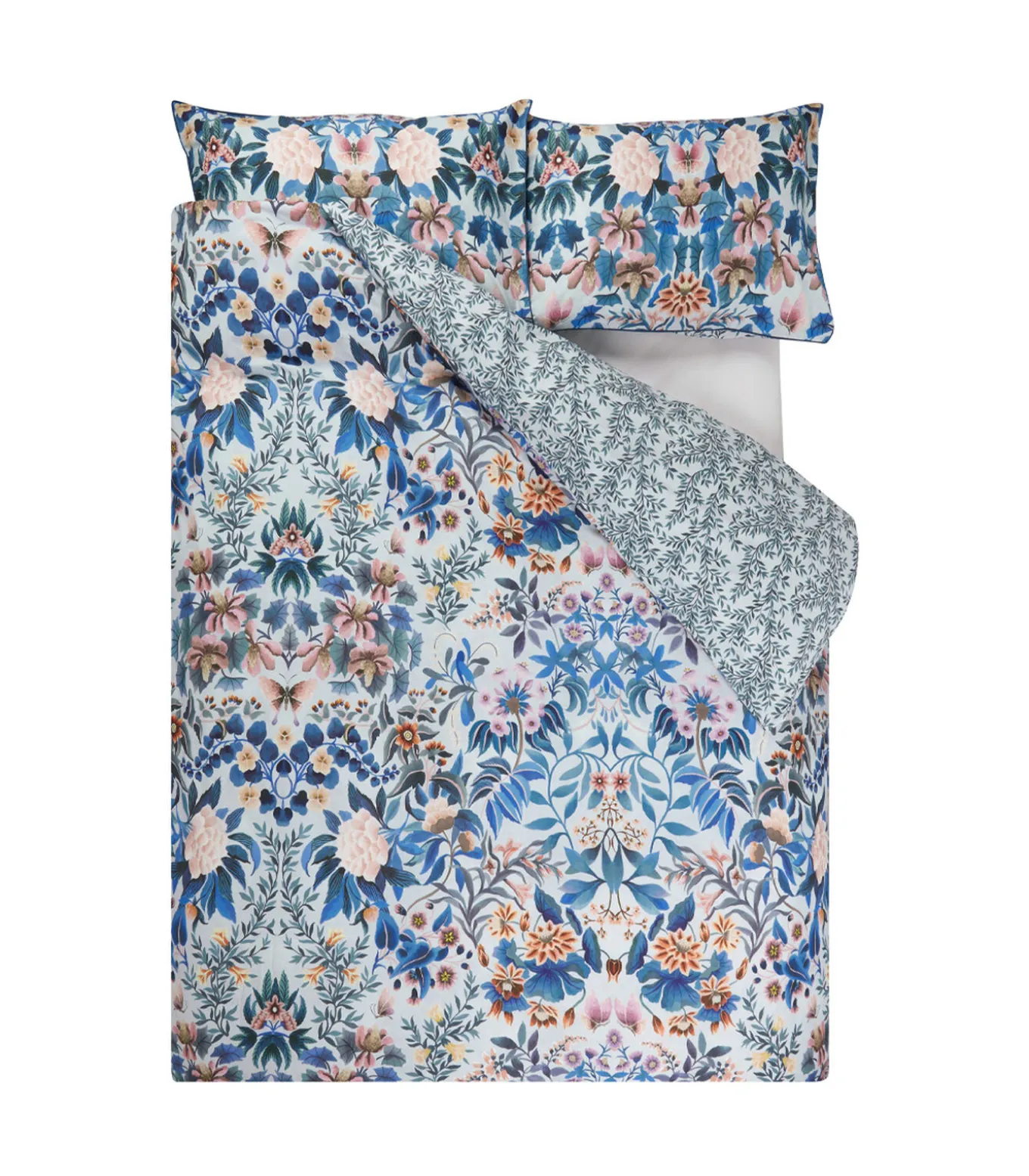 Kies voor dit eigentijdse bedlinnen met caleidoscopisch spiegeleffect. Ikebana Damast heeft een weelderig bloemenpatroon waarin gebladerte en vlinders door elkaar heen staan, in verfijnde blauwe tinten.
