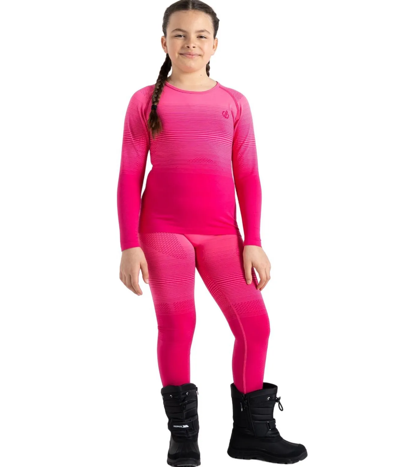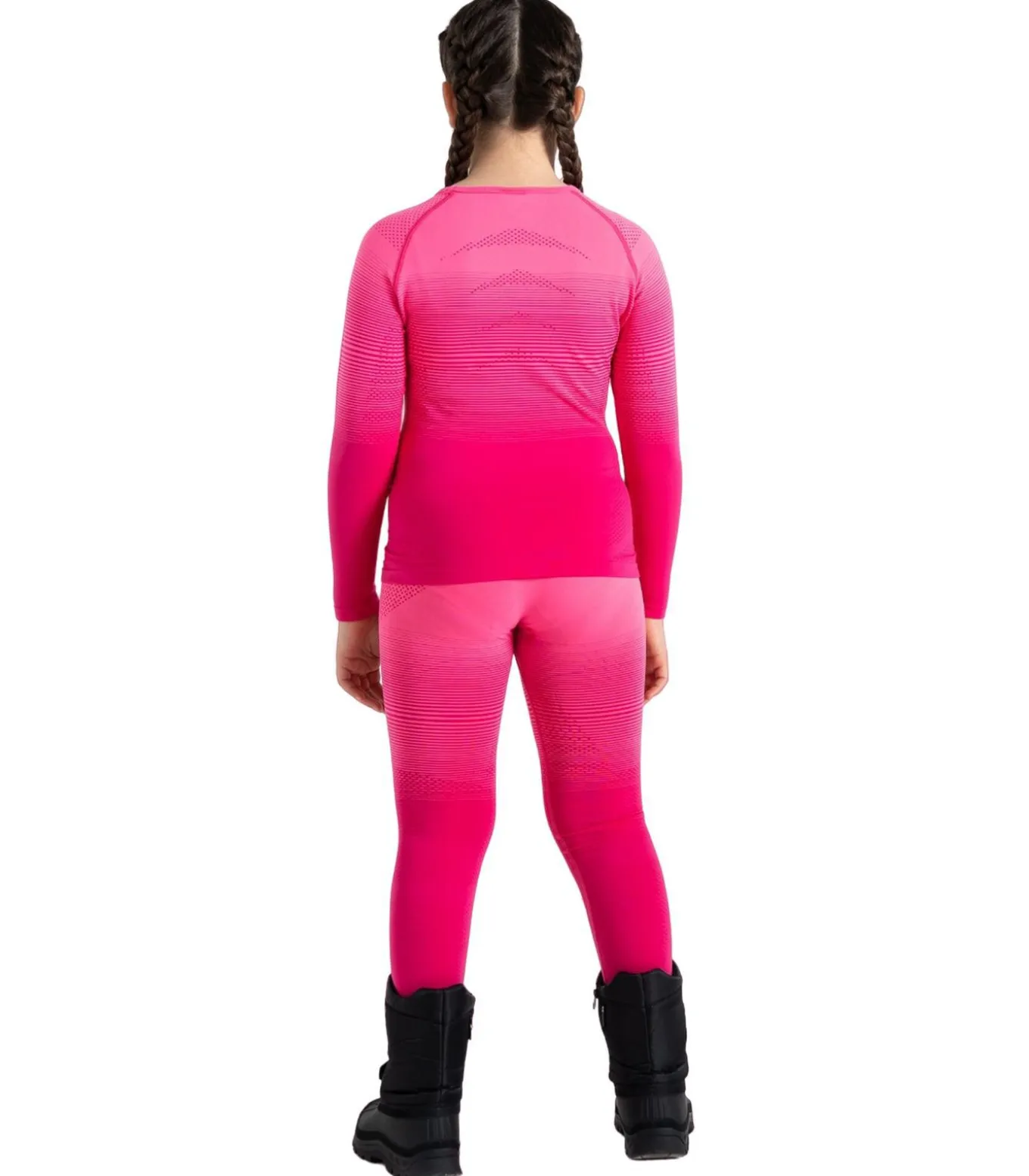 Deze set van Dare 2B Girls heeft een kleurverloop met gestreepte en driehoekige elementen. De top en legging met lange mouwen en ronde hals zijn gemaakt van 100% gerecyclede polyester stof die verschillende prestatie–eigenschappen heeft. De stof is antibacterieel, duurzaam, vochtafvoerend, geurbestrijdend en sneldrogend. Daarnaast is het zacht met temperatuurregeling, thermische regulatie en SeamSmart technologie. De legging en top hebben een naadloze constructie, ook bij de schouders, met ventilatiepanelen voor ademend vermogen. De nauwsluitende stukken zijn ontworpen voor een atletische pasvorm. Deze set actieve dameskleding wordt geleverd in een doos met één top en één legging.