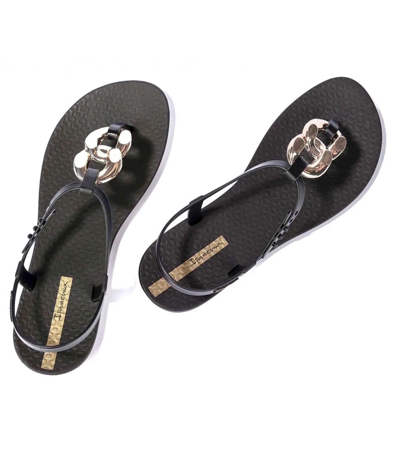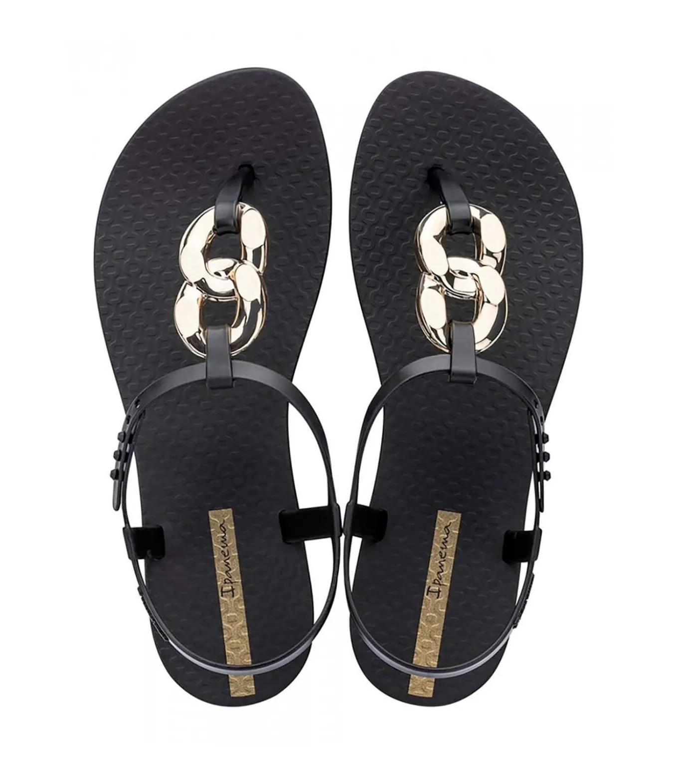 * Kleur: Zwart * Details: Elegant design met decoratieve gouden ketting op de wreef, verstelbare enkelband, antislip structuurbasis en gouden Ipanema–logo * Gebruik: Perfect voor een verfijnde zomerlook, ideaal voor casual avonden, wandelingen in de stad of casual chique evenementen.