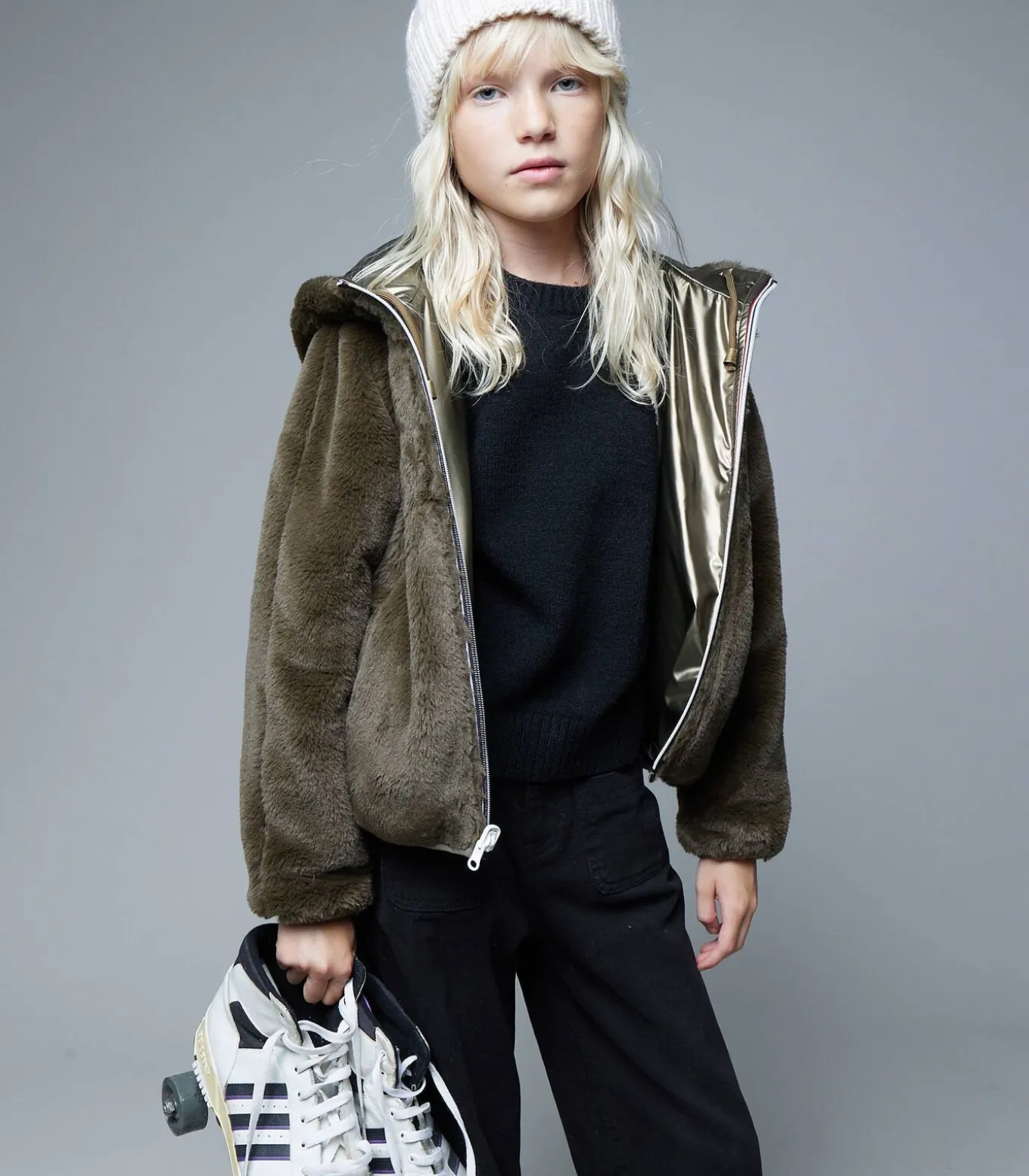 Het ISSIA–jack is het ultieme comfortabele kledingstuk met zijn fluweelzachte imitatiebont en omhullende capuchon. Dit cocooning–jack met ritssluiting en verstelbare gouden trekkoorden combineert warmte en stijl zonder compromissen. De licht afgeronde snit aan de onderkant zorgt voor een gezellig en modern silhouet, perfect om de winter zacht door te komen. ISSIA past overal bij, van een jeans tot een jurk, en geeft je look een vleugje nonchalante elegantie.