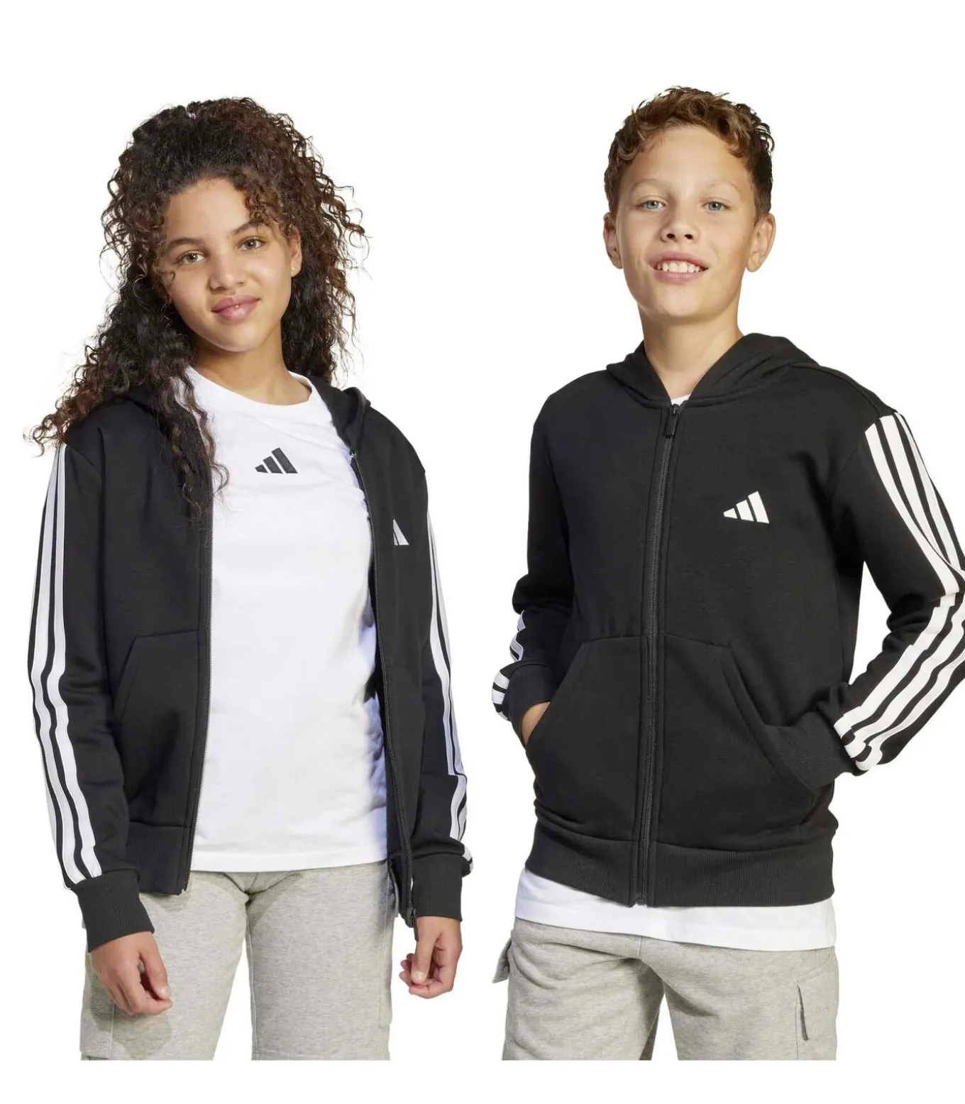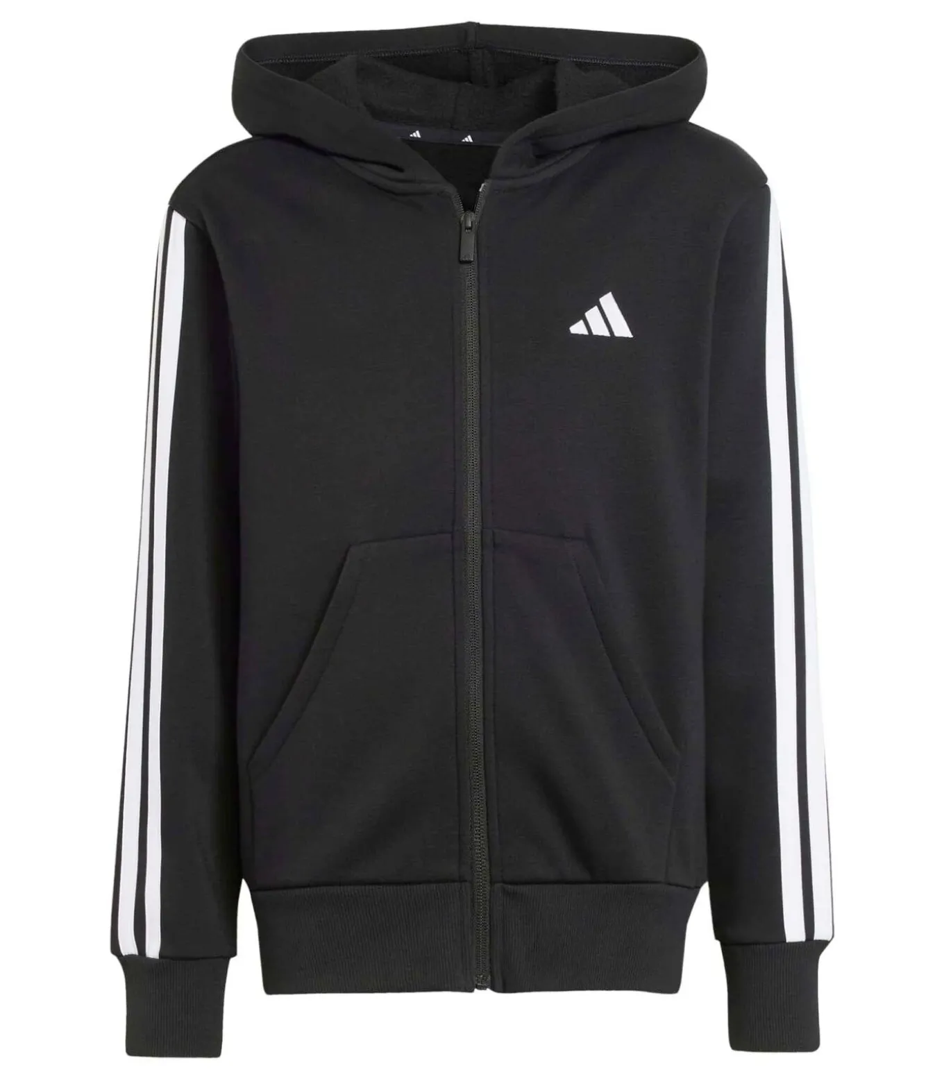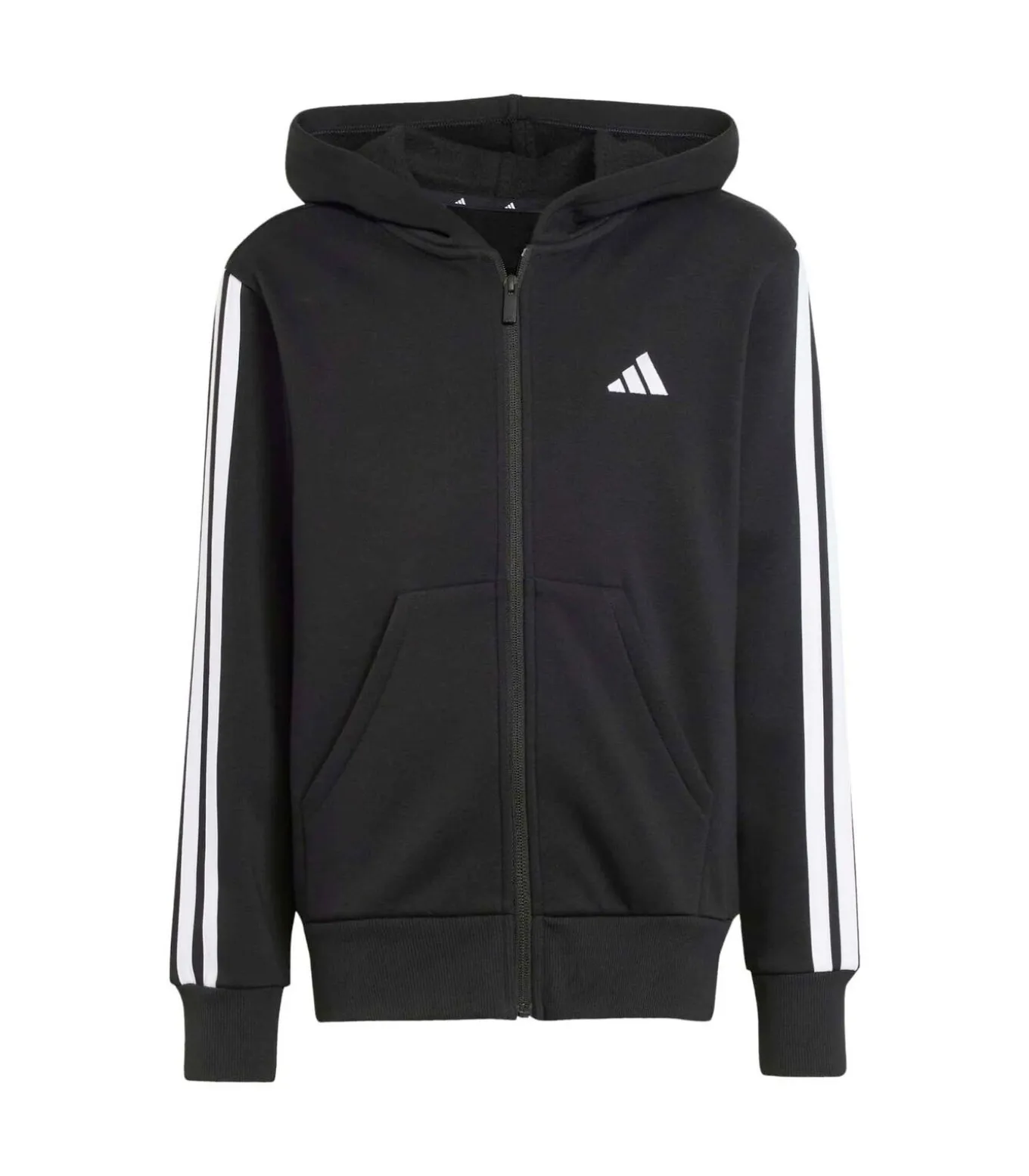 Kleur: Zwart/Wit Samenstelling: 55% katoen, 36% gerecycled polyester, 9% viscose Mouwen: Lang Halslijn: Capuchon Pasvorm: Normaal Sluiting: Rits Details: Sweatshirt van zachte fleecestof met volledige ritssluiting en verstelbare capuchon. Uitgerust met kangoeroezakken, geribbelde manchetten en zoom voor extra comfort. De iconische 3–Stripes maken de sportieve look compleet, perfect voor school of vrije tijd. Gebruik: Ideaal om de kleintjes te vergezellen op actieve dagen, tussen sport, school en ontspanningsmomenten.