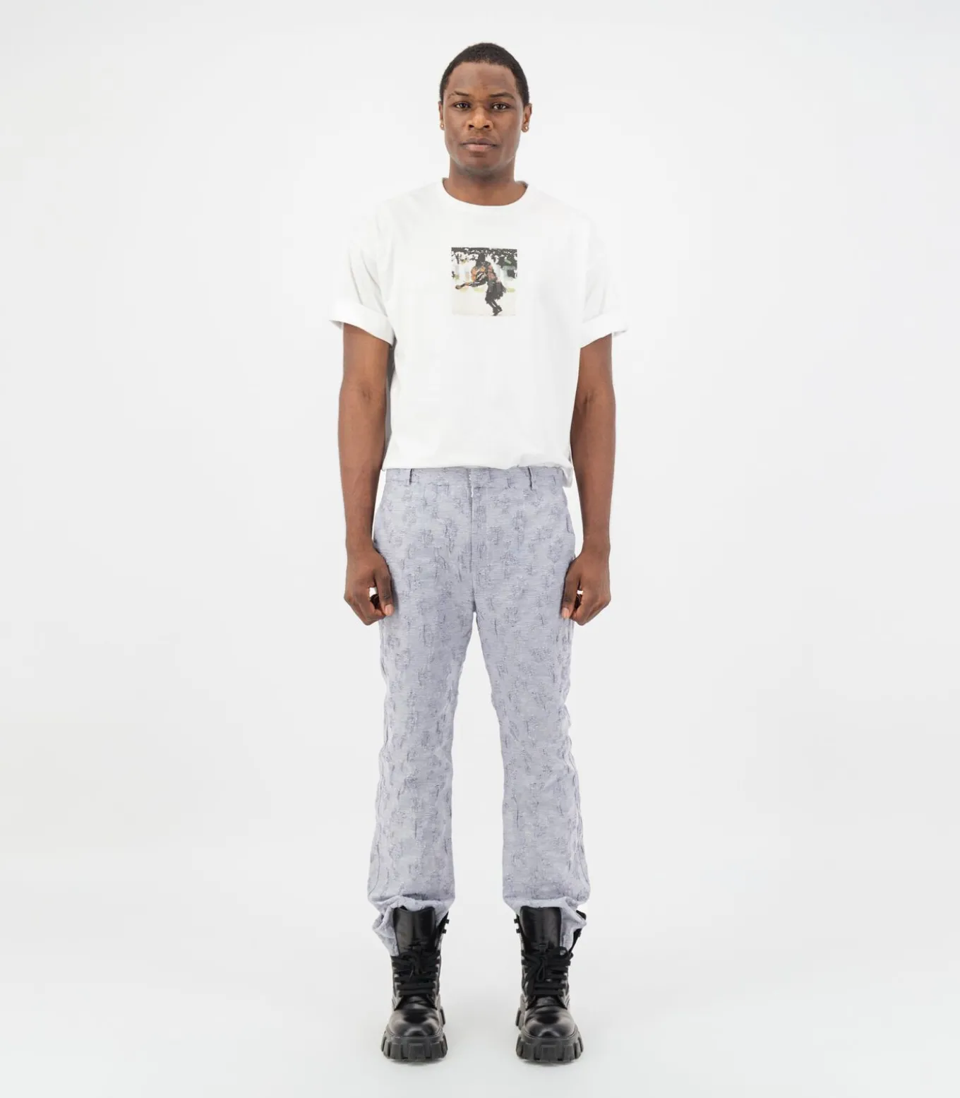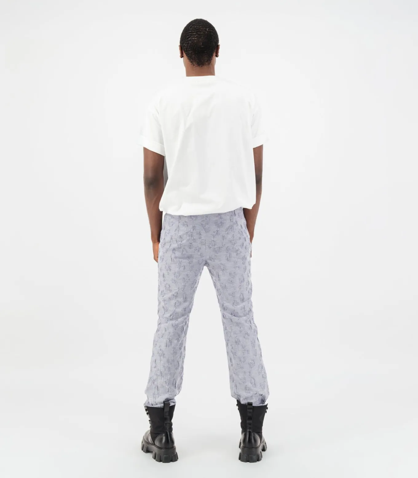 Blauwe jacquardbroek met hoge taille, rechte pijpen, riemlussen, verborgen sluiting en ritssluiting aan de voorkant.