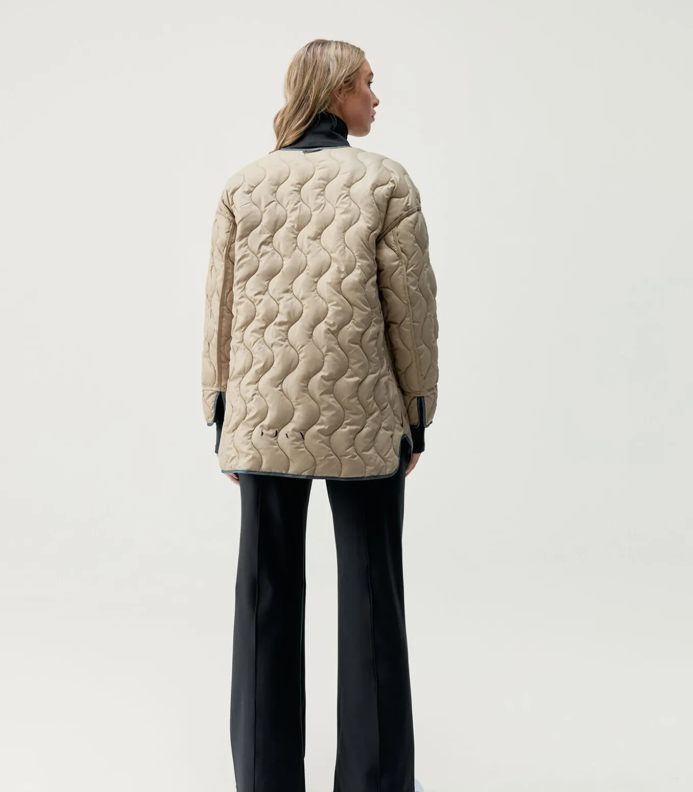 Omkeerbare tweekleurige gewatteerde jas. Windafstotende stof met thermische isolatie. Dubbele cursor ritssluiting. Opgestikte zakken aan beide zijkanten. Functioneel ontwerp met twee kleuropties om mee te pronken en super comfortabel. 100% veganistische vullingWindafstotendWaterafstotend Hoge zonnebeschermer WarmVeganistisch gewatteerd Omkeerbaar