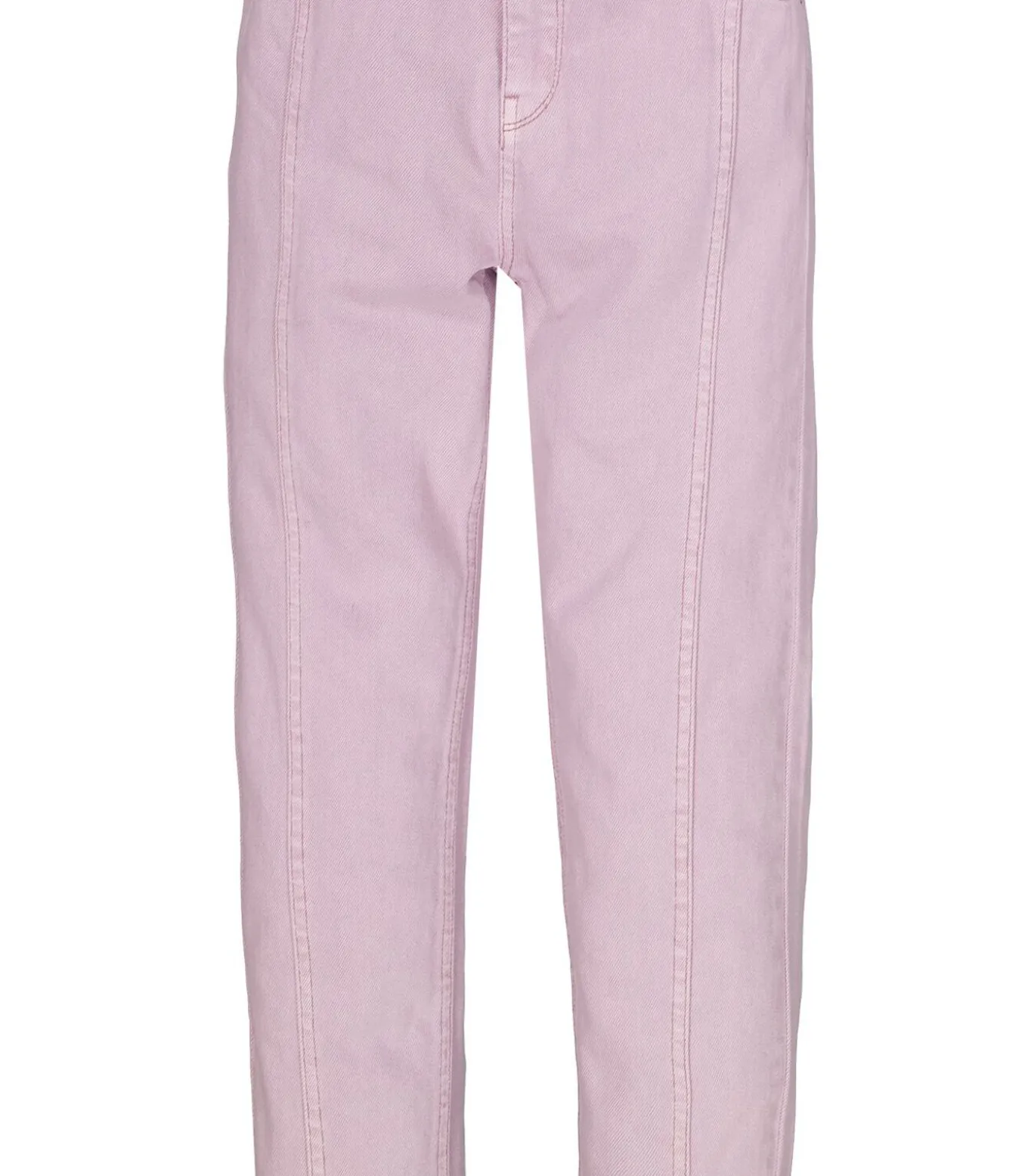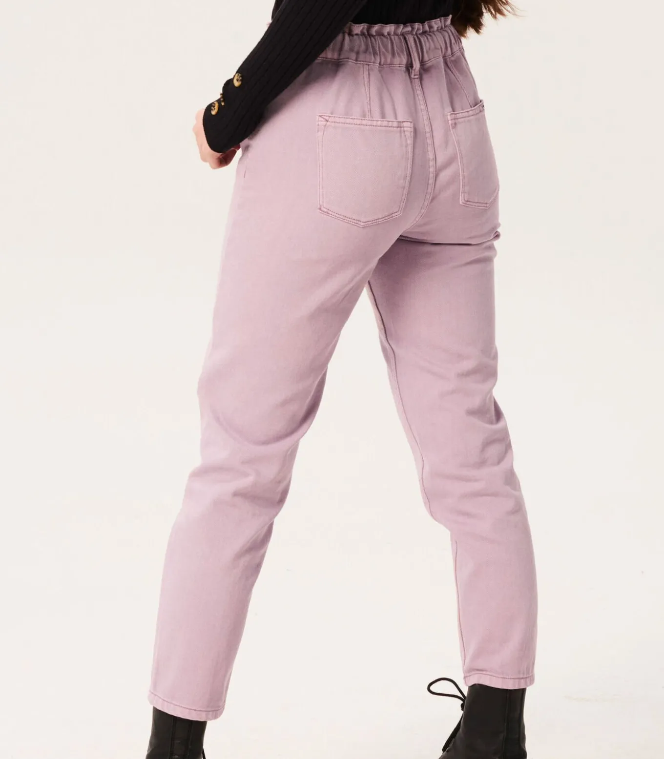 Mom fit jeans met een paars gekleurde wassing. De jeans is een 5–pocket model, heeft een paperbag waist, een tapered leg en sluit met een knoop– en ritssluiting. Dit item is gemaakt van 100% katoen.
