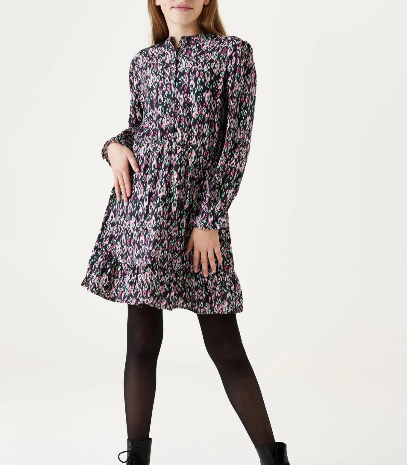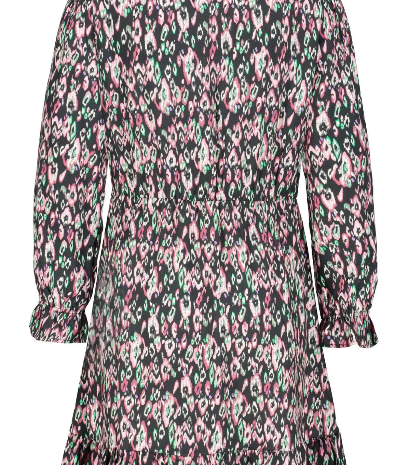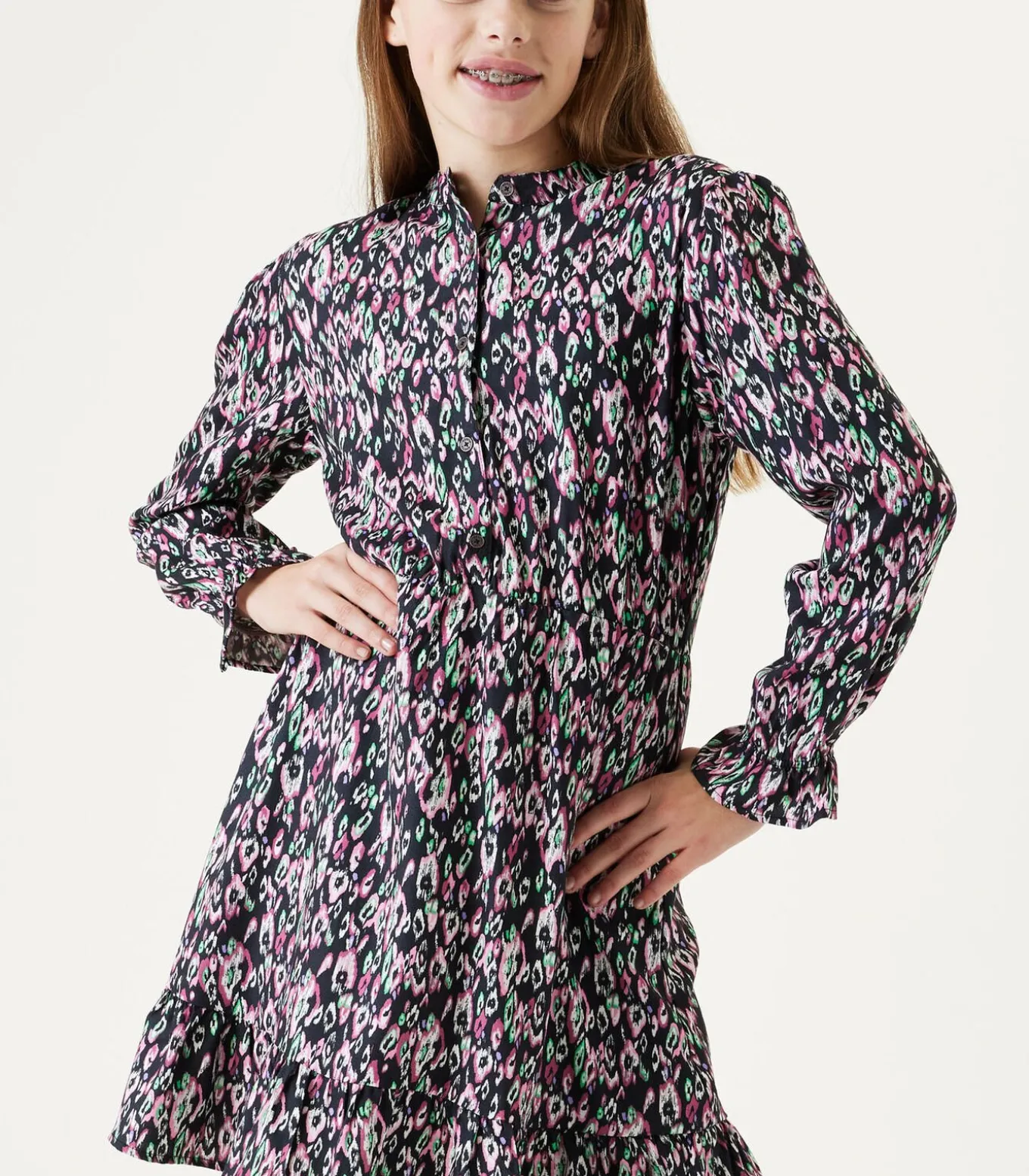 Jurkje met allover print. Deze jurk heeft lange mouwen, een opstaande hals, een knoopsluiting en een regular fit. Dit item is gemaakt van 100% viscose.
