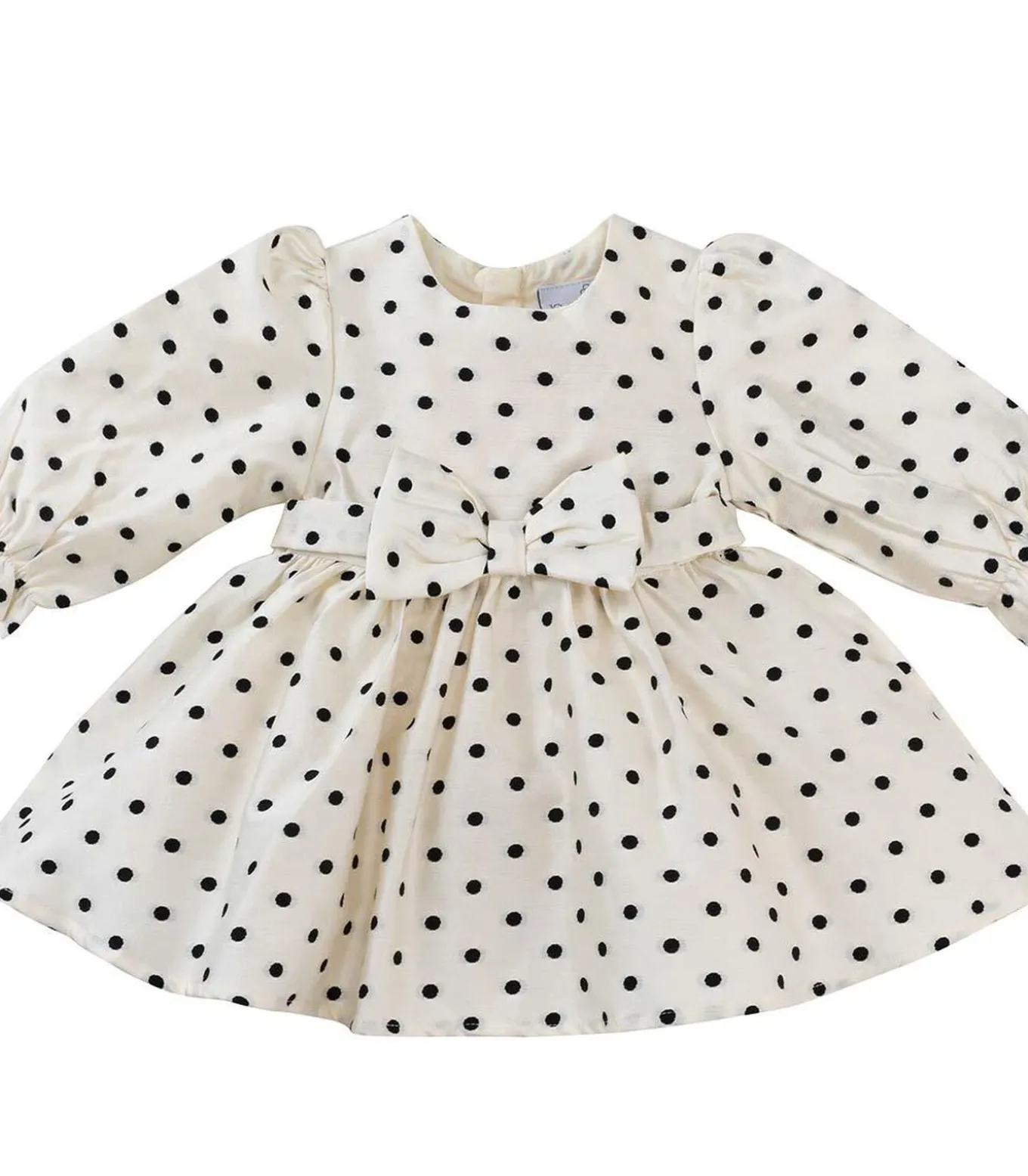 Crèmekleurig kleedje met zwarte stippen. Het kleedje heeft vooraan een strik met hetzelfde motief en een ritssluiting langs de achterzijde.