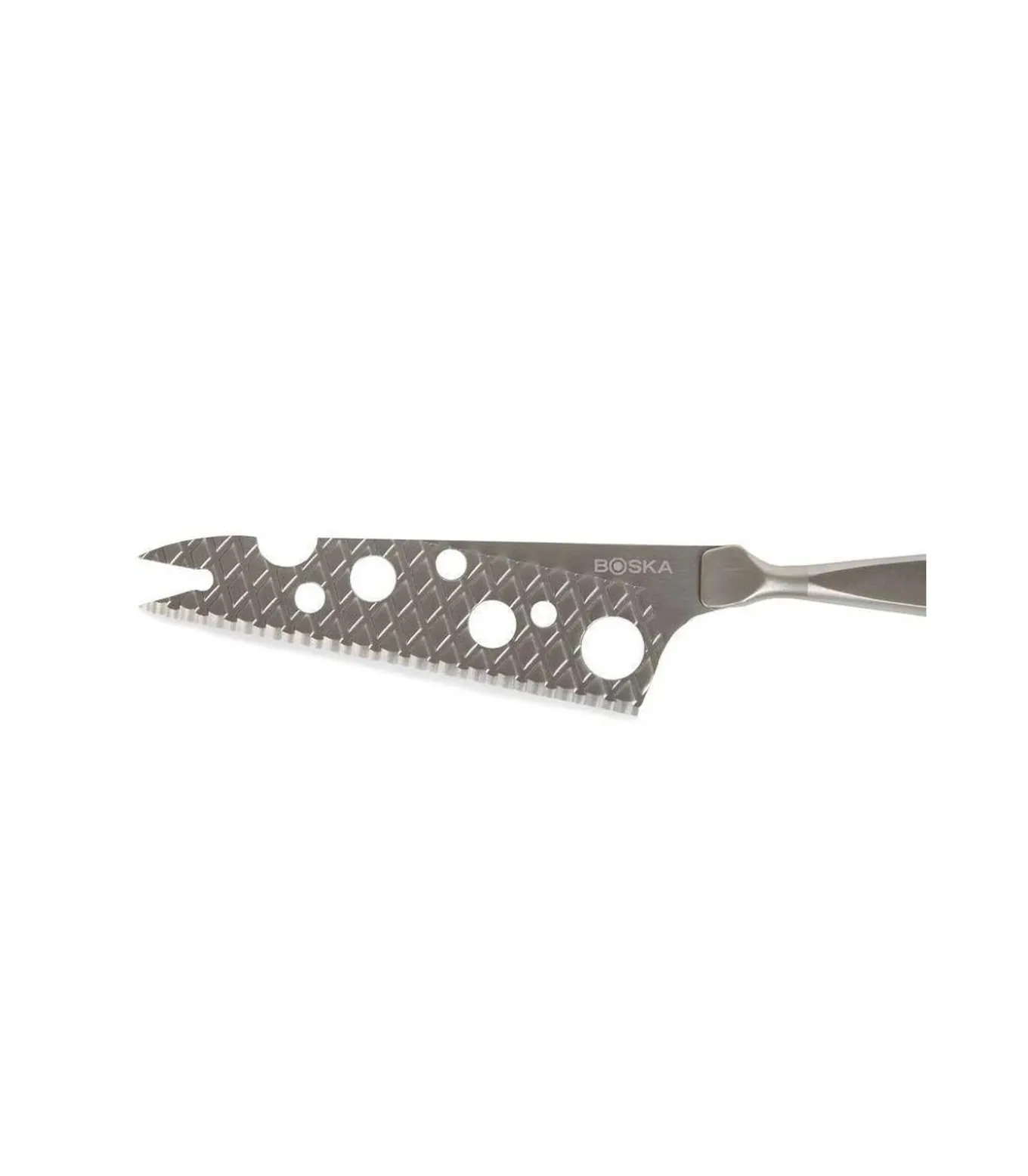 Boska Kaasmes Halfzachte Kaas Monaco+Het Boska Kaasmes voor Halfzachte Kaas van Monaco+ is perfect voor het snijden van halfzachte tot halfharde kaas. De kaas zal in ieder geval niet blijven plakken, want het wafelpatroon en de non–stick coating doen daar alles tegen. Verder zorgen de gaten ervoor dat er weinig weerstand is tijdens het snijden. Ook is dit mes nog multifunctioneel, want hij heeft twee puntjes waar je je kaas op kan prikken na het snijden.