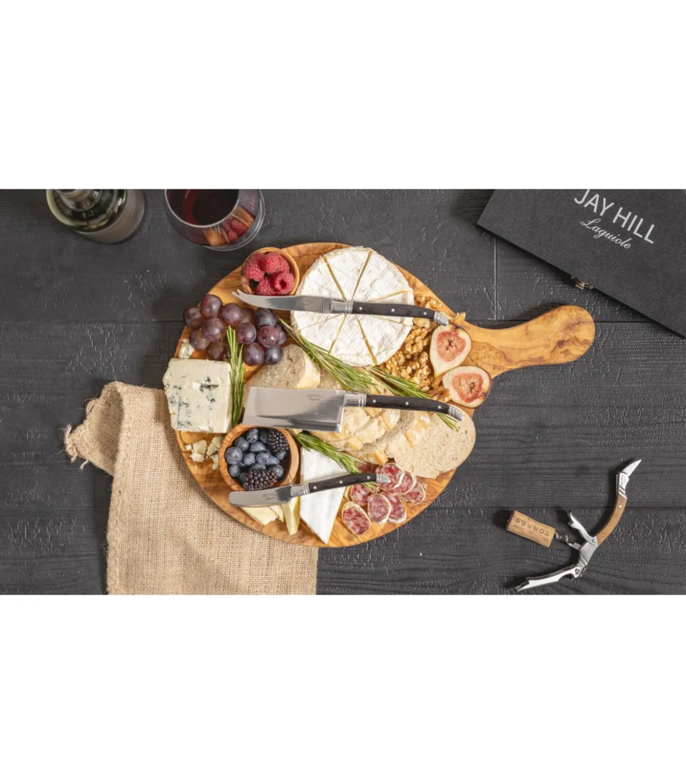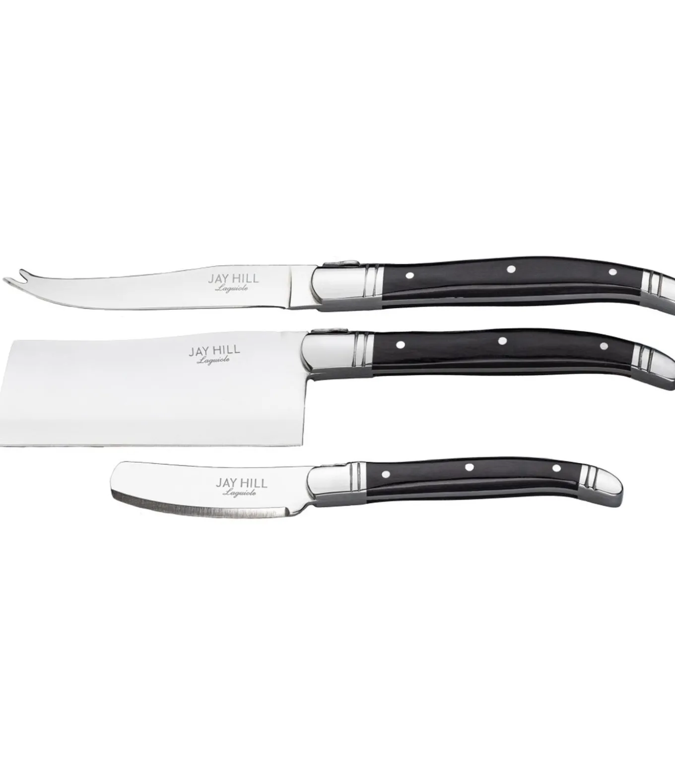 Een heerlijk kaasplankje met een glas rode wijn: krijg je er al zin in? Met deze Jay Hill kaasmessenset Laguiole zwart heb je een luxe set van drie verschillende kaasmessen. De twee kaasmessen en het hakbijltje zijn geschikt voor zowel harde– als zachte kazen. Deze stijlvolle messen beschikken over een elegant zwart handvat gemaakt van ebbenhout.Wil je kaasmessen cadeau geven aan familie of vrienden? Deze Jay Hill kaasmessen Laguiole zwart worden geleverd in een luxe houten kist met mooie geschenkverpakking.