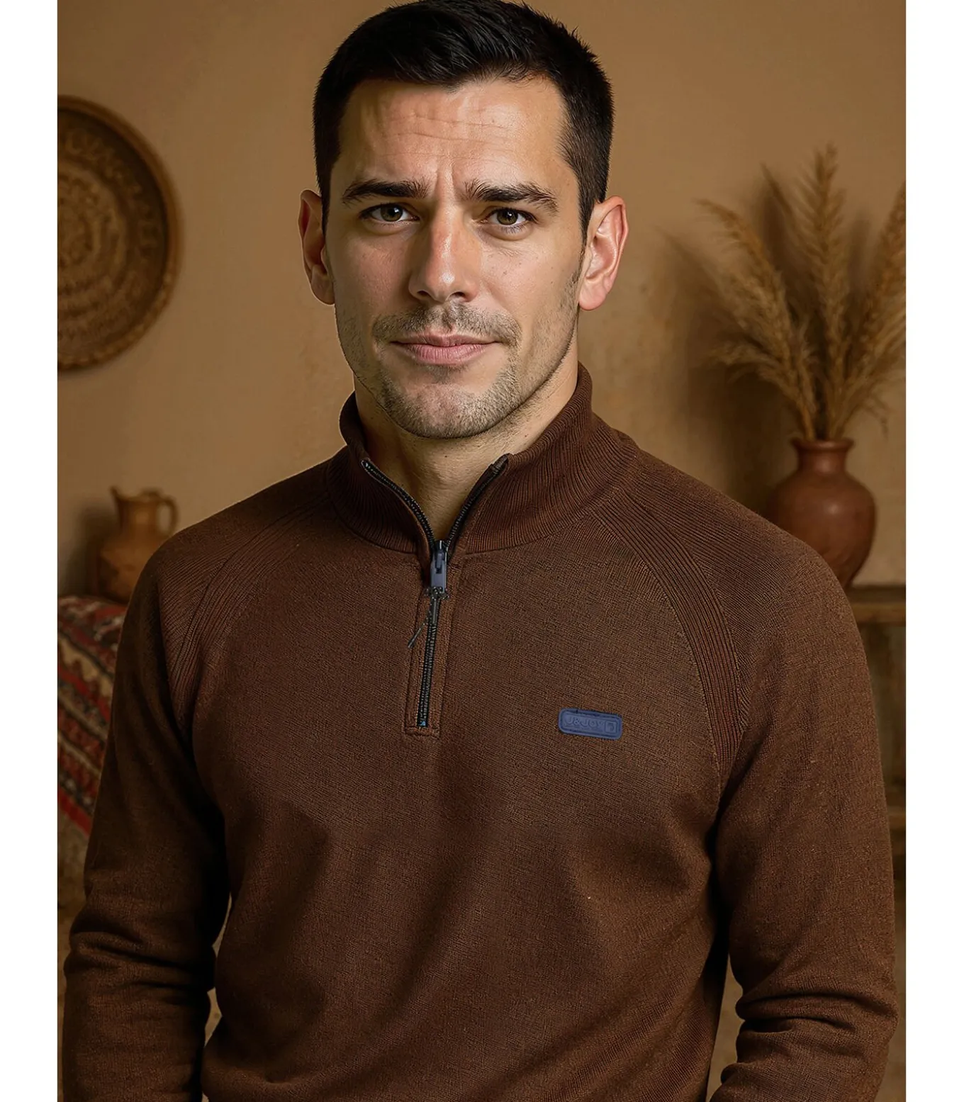 Ga voor een urban en trendy look met deze kaki herentrui met rits, geïnspireerd op de dynamische geest van Mindo. Gemaakt van een mix van 45% nylon, 30% acryl, 20% viscose en 5% kasjmier, biedt deze trui zowel warmte als comfort. De rechte snit en opstaande kraag met rits geven dit kledingstuk een moderne en praktische touch. De geribbelde stretchboorden en manchetten zorgen voor een perfecte pasvorm, terwijl de lange mouwen een extra vleugje stijl toevoegen. Het uitgewiste J&JOY–logo op het hart getuigt van de authenticiteit en kwaliteit van deze trui. Voeg een veelzijdig item toe aan je garderobe door nu te bestellen.