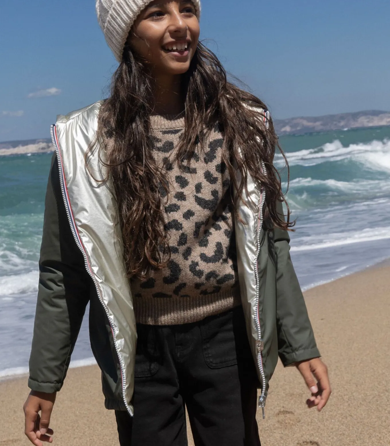 Meisjesjas KALIVIA. Deze omkeerbare, casual jas heeft een twee–in–één design: een gladde marineblauwe kant met een matte finish en een metallic kant met een trendy spiegeleffect. De losse, rechte snit zorgt voor optimaal comfort. Met een wikkelcapuchon, een contrasterende rits en twee onzichtbare zijzakken is deze naadloze, halflange jas perfect om koele dagen stijlvol tegemoet te treden.
