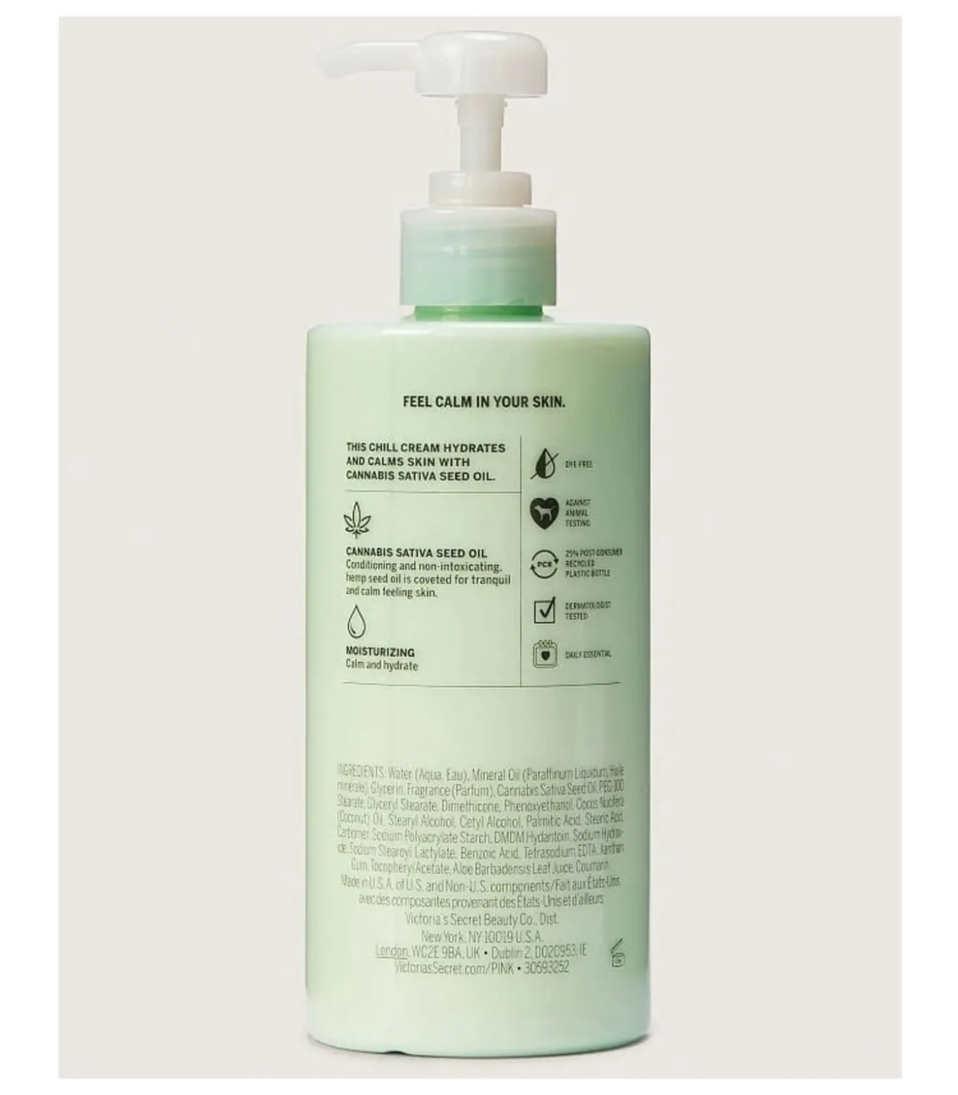 Voel de kalmte in je huid met de Kalmerende Bodylotion Coco Chill van Pink. Deze goddelijke mix van Cannabis Sativa zaadolie en kokosolie creëert een ongeëvenaarde ervaring voor de huid. Kokosolie, rijk aan mega–verzachtende vetzuren, hydrateert diep en laat een uitzonderlijk gladde afwerking achter. Daarnaast wordt Cannabis Sativa zaadolie, conditionerend en niet bedwelmend, begeerd om zijn kalmerende eigenschappen. Elke fles is dermatologisch getest, wat premium kwaliteit garandeert. Met meer dan 200 pompen per fles is onze Bodylotion een dagelijkse essentie voor een stralende huid. We zijn toegewijd aan kwaliteit en ethiek, zonder dierproeven, vermijden van kleurstoffen in onze formule en het gebruik van plastic flessen gerecycled na consumptie tot 25%. Met zorg vervaardigd in de Verenigde Staten, biedt onze lotion een allesomvattende ervaring, van de formulering tot de perfectie van het eindproduct. Geef je huid de rust die ze verdient met de Kalmerende Bodylotion Coco Chill van Pink.