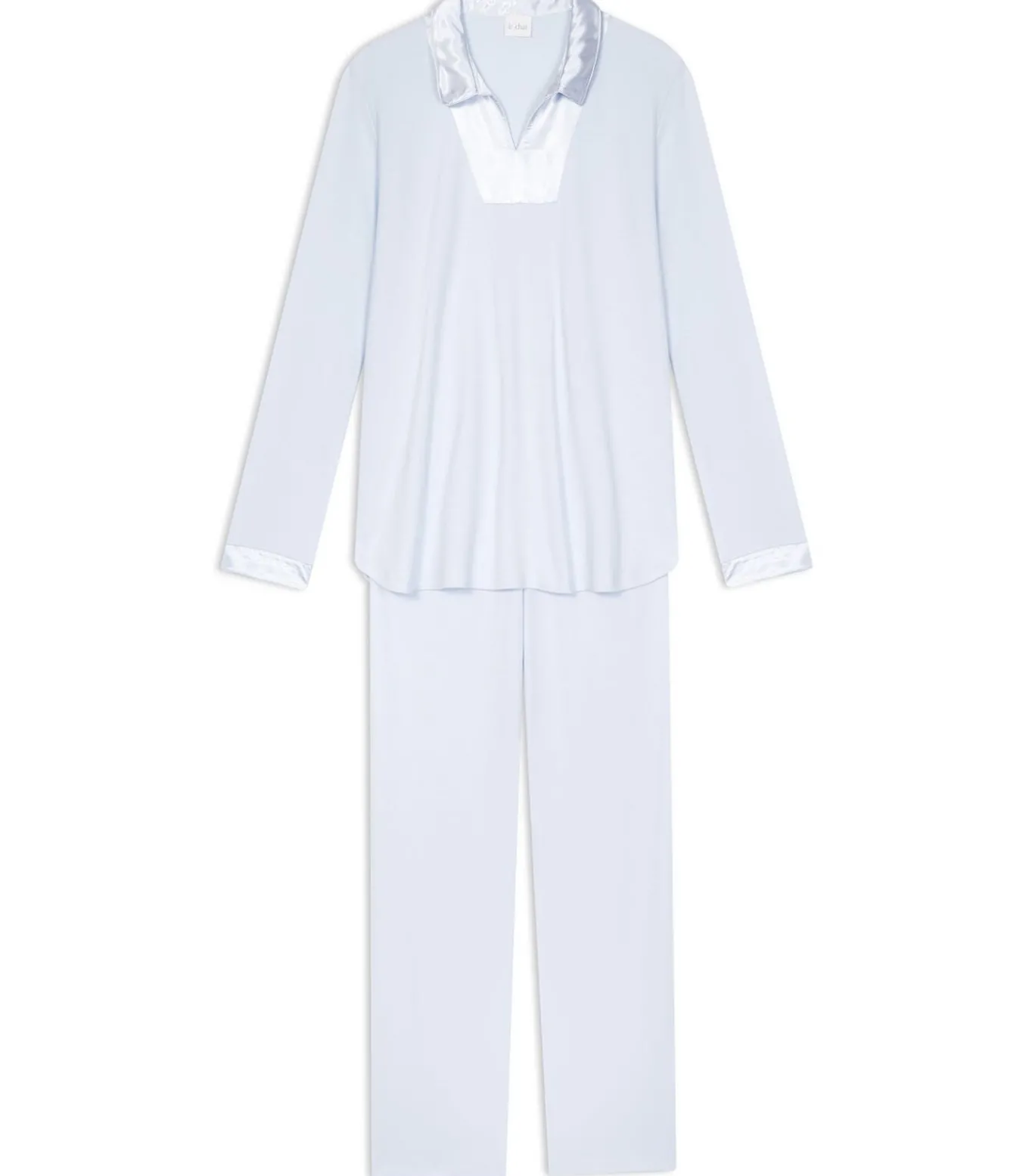 – De open V–hals in polostijl met borststuk, manchetten en tailleband van de broek zijn gemaakt van satijn, wat een mooie lichte toets geeft aan de Andy–pyjama.