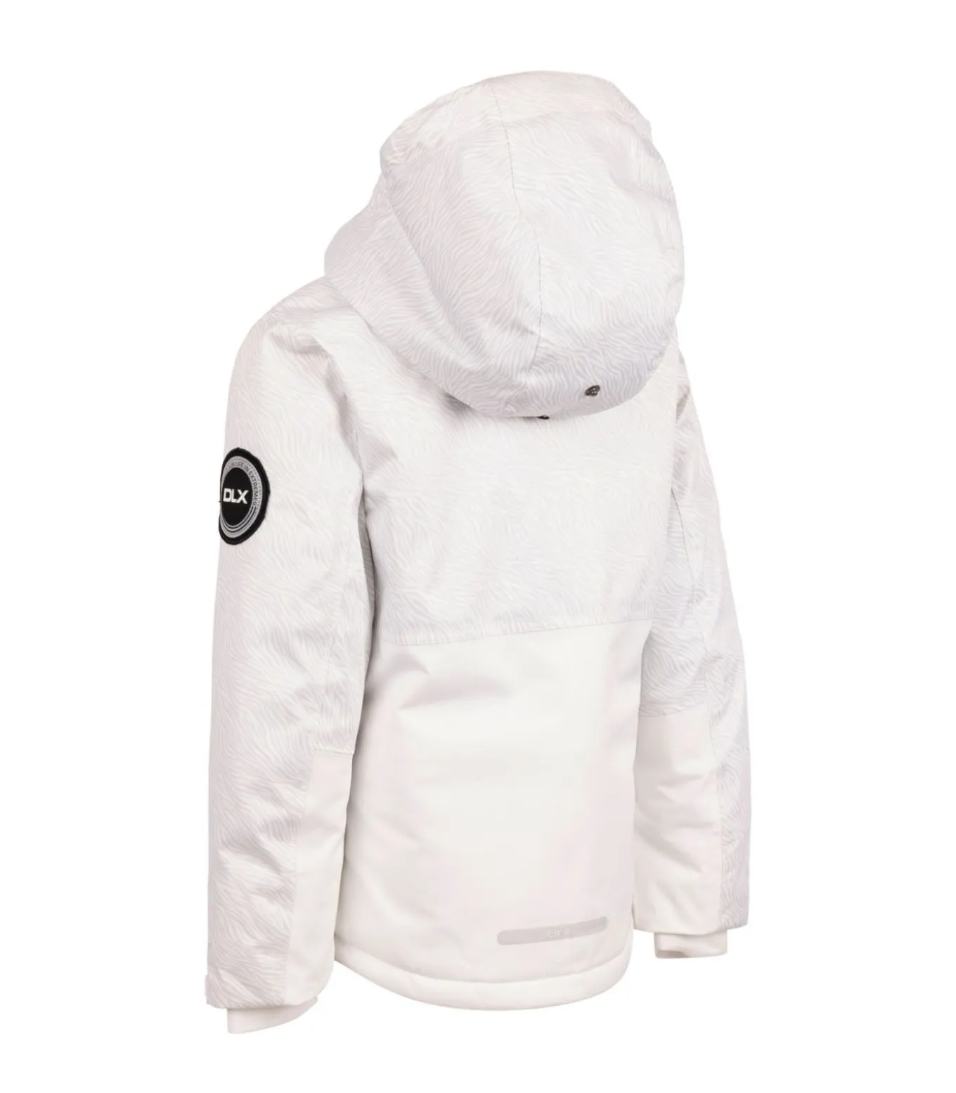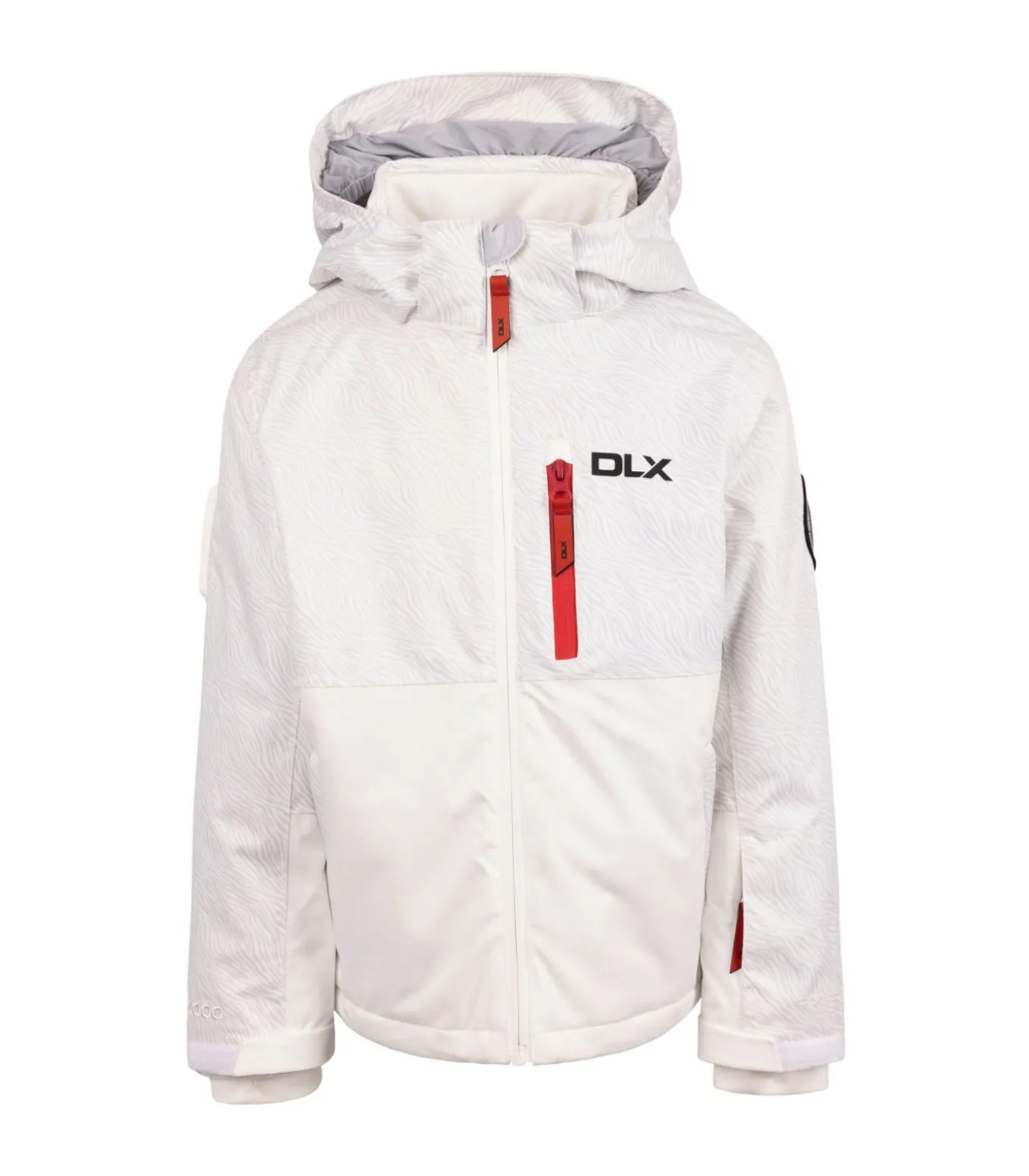 De Trespass Childrens/Kids Keeya DLX Ski Jacket heeft een geruit ontwerp met een capuchon en lange mouwen. De jas heeft een patch op de mouw, manchetten met drukknopen en een capuchon voor volwassenen. De jas heeft twee steekzakken, een borstzak met ritssluiting en een volledige ritssluiting. De beschikbare maten variëren van 2–3 jaar (21 inch) tot 11–12 jaar (31 inch), met oplopende maten voor 3–4 jaar (22 inch), 5–6 jaar (24 inch), 7–8 jaar (26 inch) en 9–10 jaar (28 inch).
