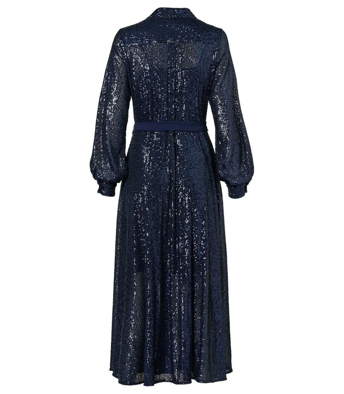 Straal luxe en elegantie uit met de Kelly paillettenjurk in navy, een feestelijke blikvanger die verfijning en glamour samenbrengt. De jurk is volledig bezet met fonkelende navykleurige pailletten op een diep donkerblauwe basis, wat zorgt voor een rijke en mysterieuze uitstraling. Perfect voor feestdagen, gala’s en andere bijzondere gelegenheden. De reverskraag en lange mouwen met subtiel pofdetail bij de manchetten geven het ontwerp een moderne en vrouwelijke touch. De taille kan benadrukt worden met het donkerblauwe strikceintuur in contrasterende stof, dat eenvoudig verwijderd kan worden voor een andere stijl. Met een blinde knoopsluiting en een losse onderjurk is comfort gegarandeerd. De kuitlange lengte en uitlopende rok zorgen voor een vloeiende beweging, waardoor de jurk kracht en elegantie uitstraalt bij iedere stap. Dit ontwerp belichaamt Mart Visser’s Haute Couture: tijdloos, stijlvol en krachtig.