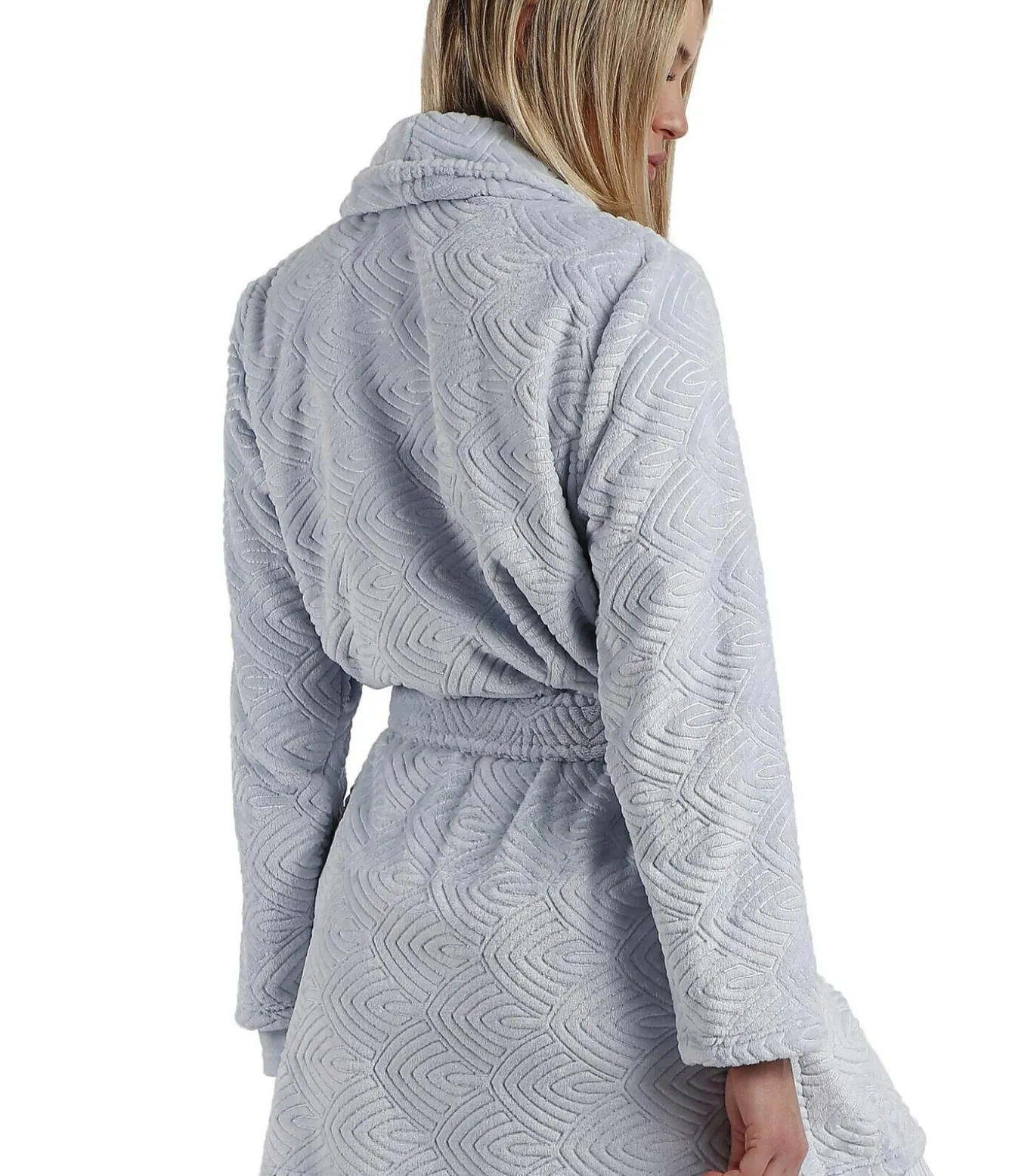 Zeer warme badjas van Corel fleece, met een golvend patroon over de hele jurk. Ultrazacht en comfortabel, perfect voor winteravonden of ontspannen dagen thuis. Hij heeft lange mouwen en praktische steekzakken. Hij kan dicht worden gedragen dankzij een ceintuur die in de taille kan worden geknoopt en een knoopsluiting aan de voorkant.