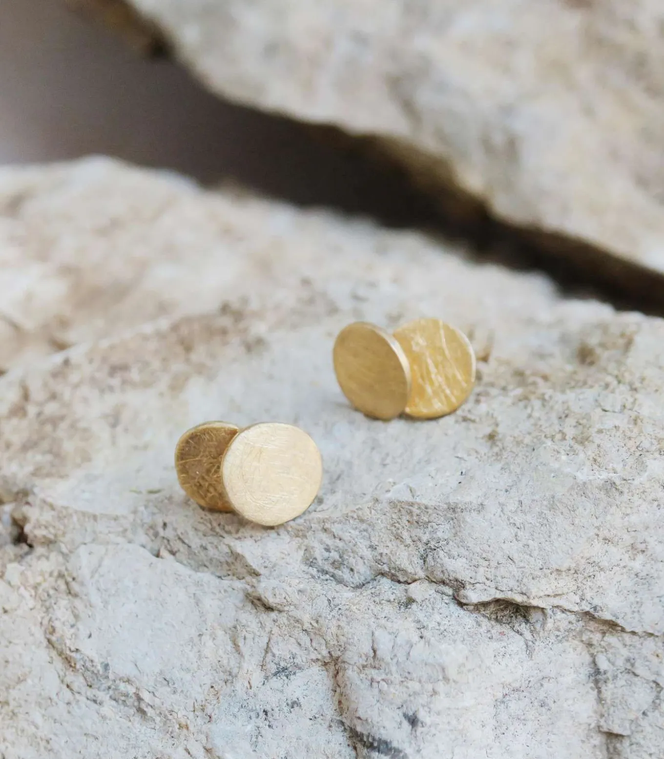 Kleine oorbellen van mat, met de hand bewerkt metaal, verguld met 24–karaats goud, met glanzende uiteinden. Het ontwerp bestaat uit twee kleine cirkels die elkaar overlappen. Vlindersluiting.