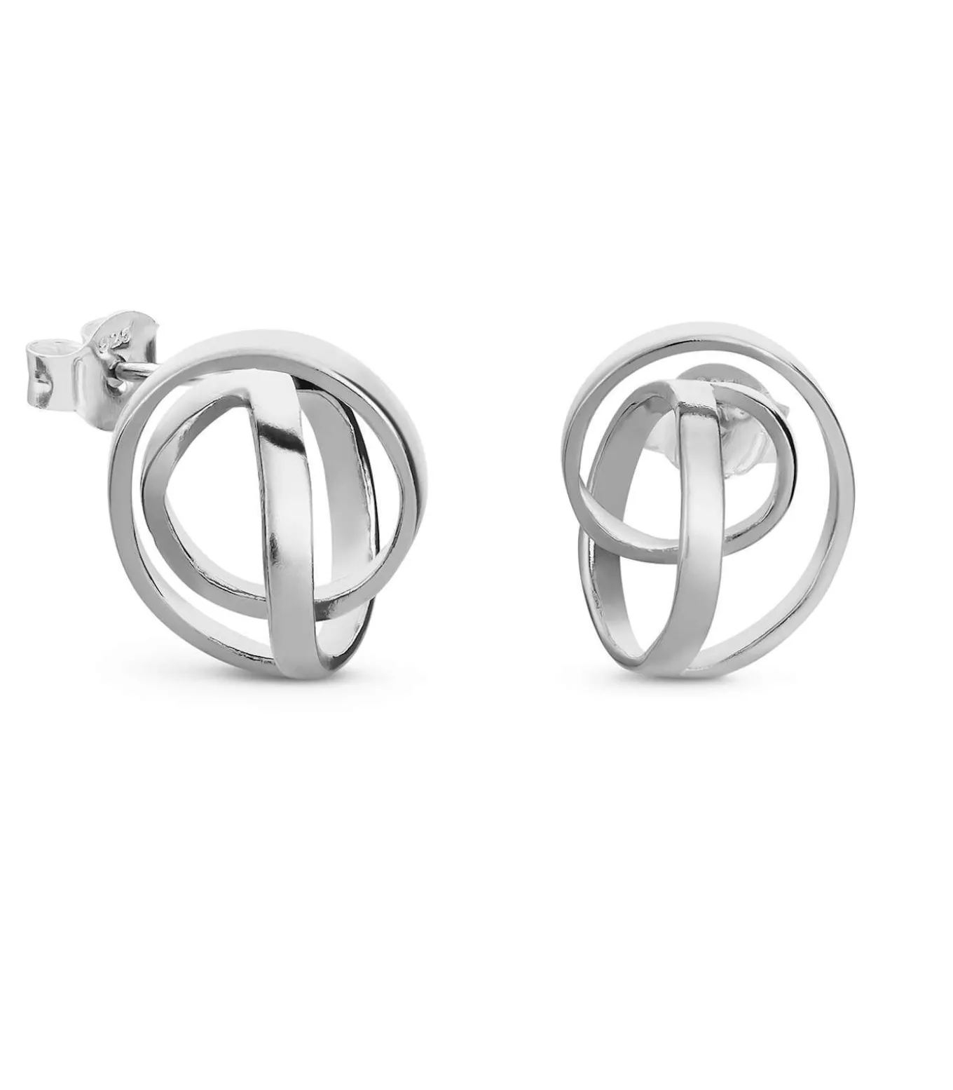 Kleine oorbellen van glanzend zilver met een platinalaag. Sculpturaal ontwerp opgebouwd uit in elkaar grijpende metalen banden. *Het zorgvuldige handwerk van deze collectie maakt elk stuk uniek in grootte en vorm. Daardoor kunnen de paren asymmetrisch zijn.