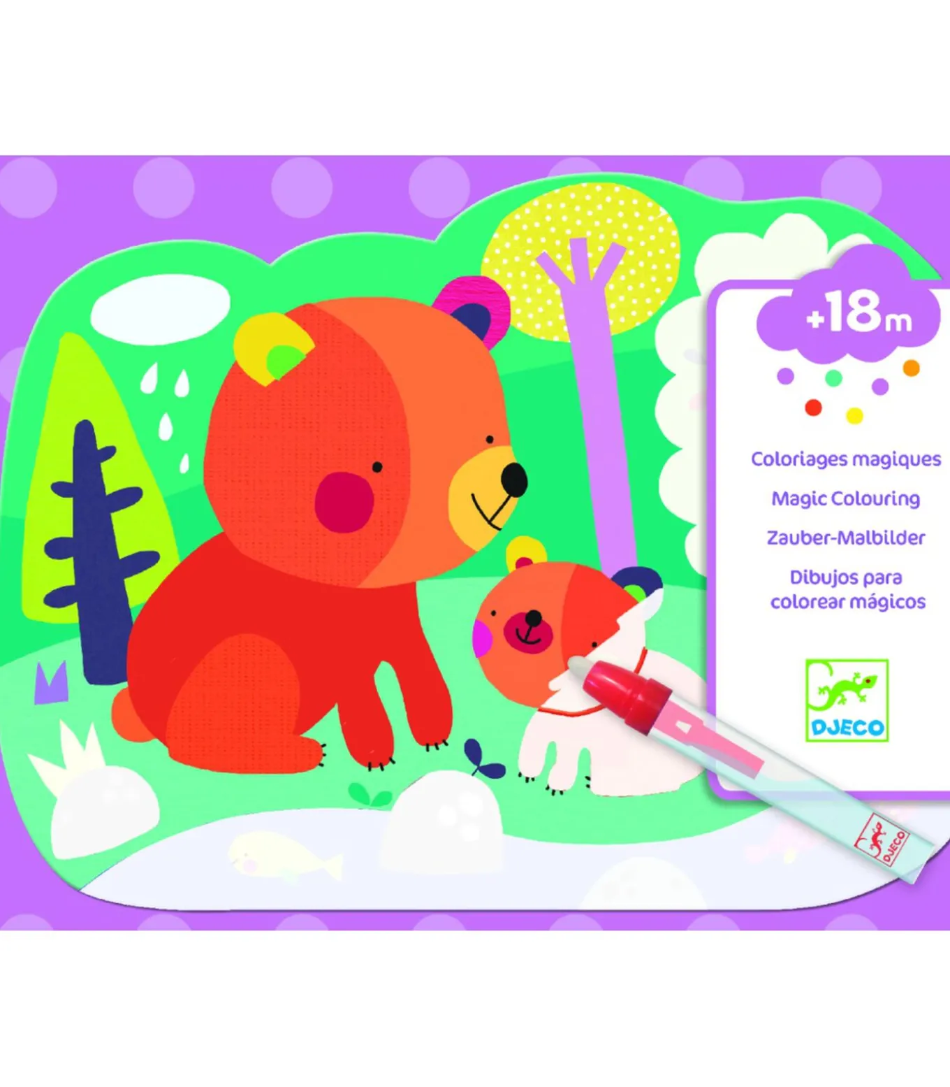 Inhoud: 4 kleurplaten van zacht plastic met een verdwijnend wit vlak, een watertankpotlood en een dikke kartonnen steun.