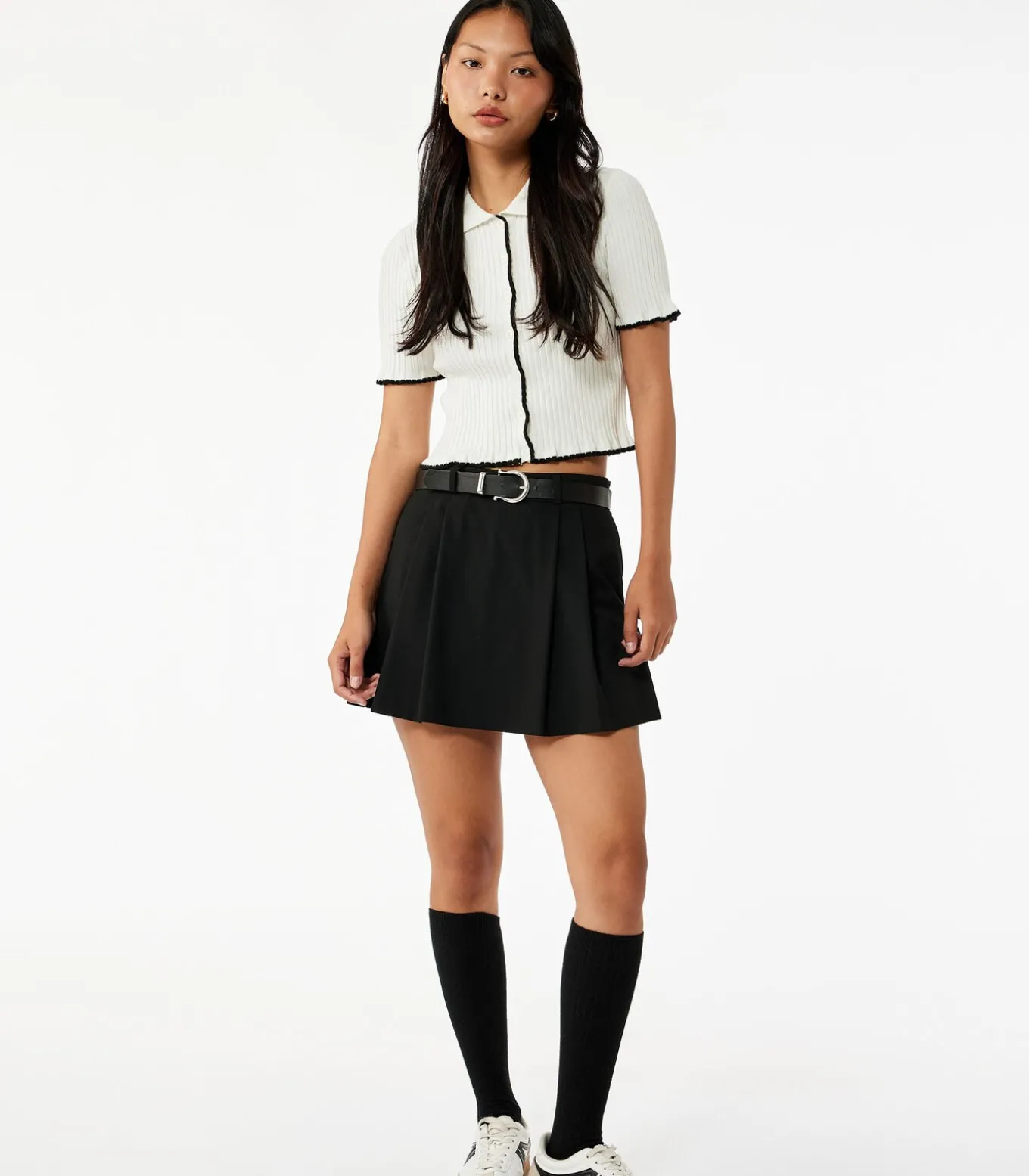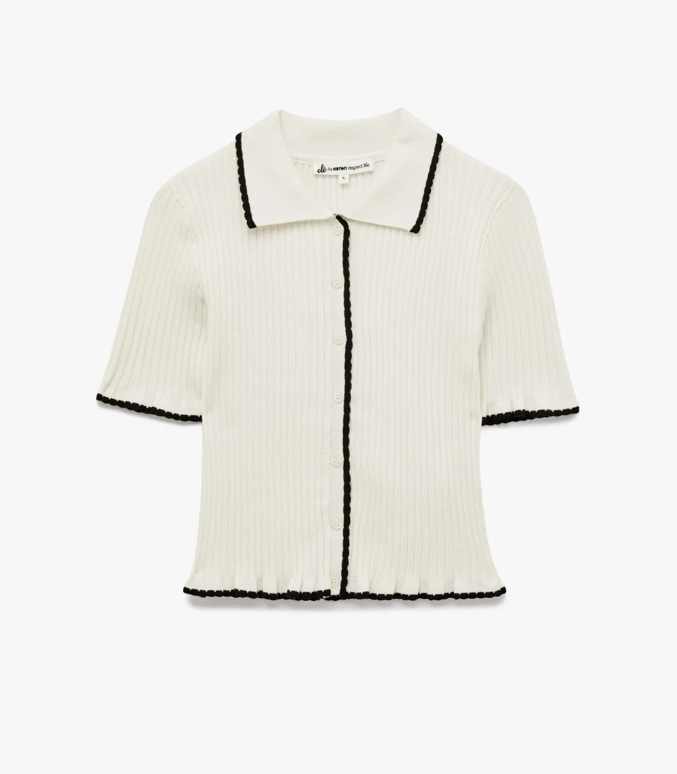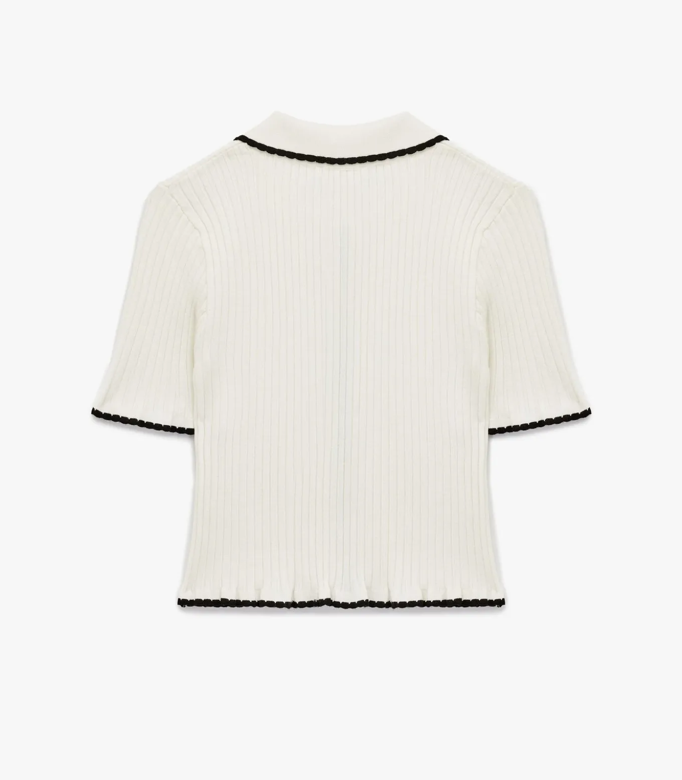 Deze elegante trui met korte mouwen en een karakteristieke polo kraag combineert klassieke stijl met moderne flair. Het ribpatroon voegt textuur toe, terwijl de knoopsluiting en contrasterende zwarte accenten zorgen voor een verfijnde uitstraling. Perfect te combineren met zowel een hoge taille spijkerbroek als een elegante rok voor een stijlvolle uitstraling.
