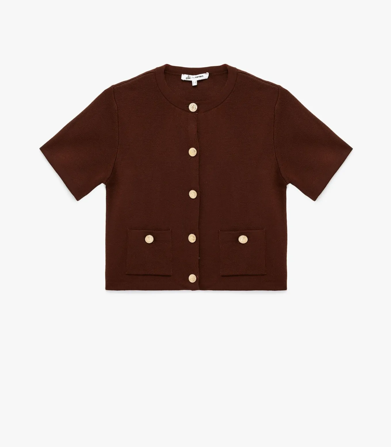 Deze stijlvolle bruine trui met korte mouwen biedt een moderne uitstraling en is ideaal voor diverse gelegenheden. Het ontwerp combineert elegantie met praktisch gebruik dankzij de knoopsluiting en handige zakdetails. De trui is perfect om te dragen over een blouse of alleenstaand voor een casual look. Gemaakt van 100% acryl, biedt het comfort en een aangename pasvorm voor dagelijks gebruik.