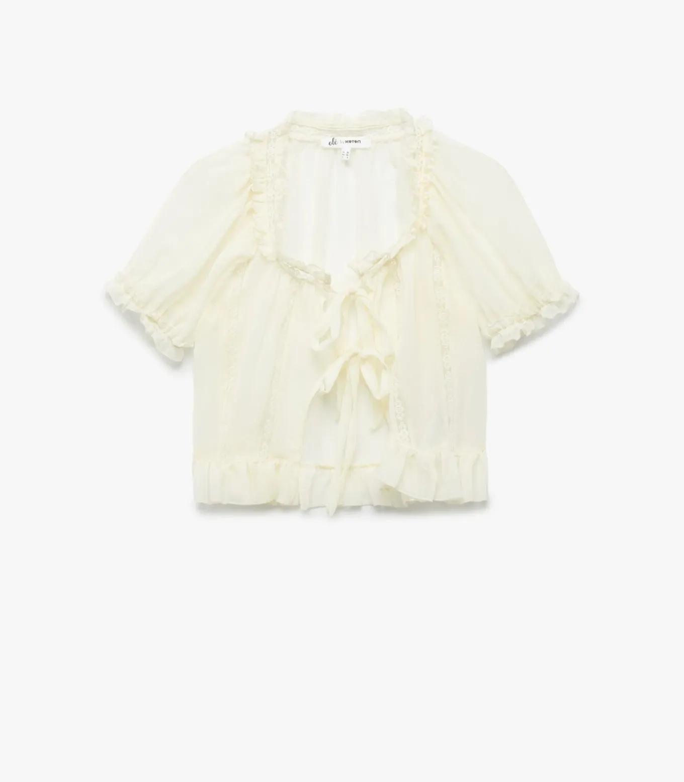 Lace detailed short puff sleeve tie bowtie crop blouse.