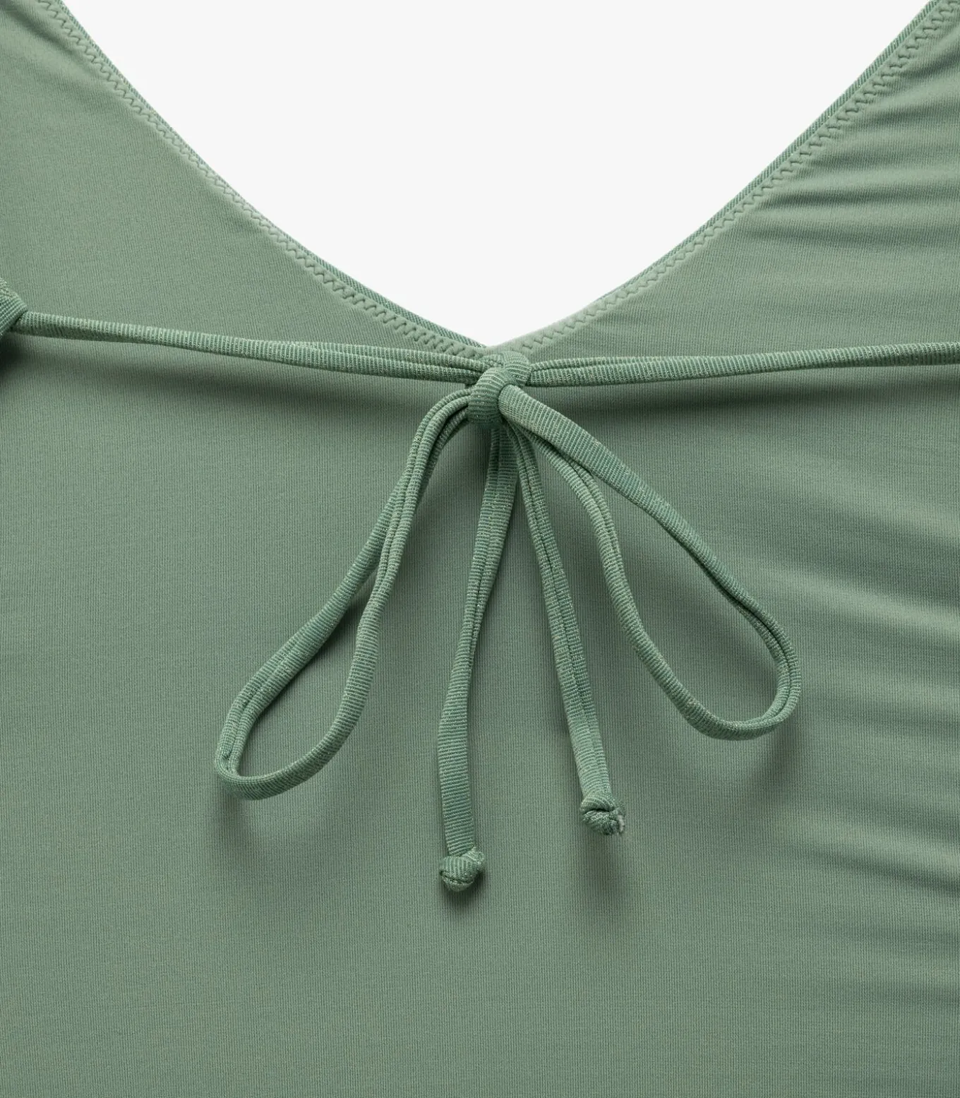 Lined back–tie detail beaded deep V–neck swimsuit.