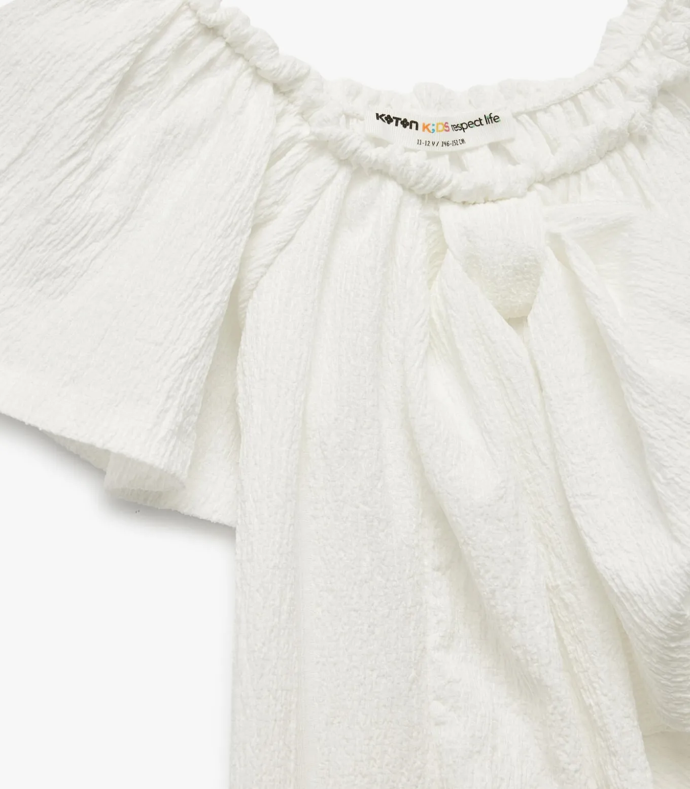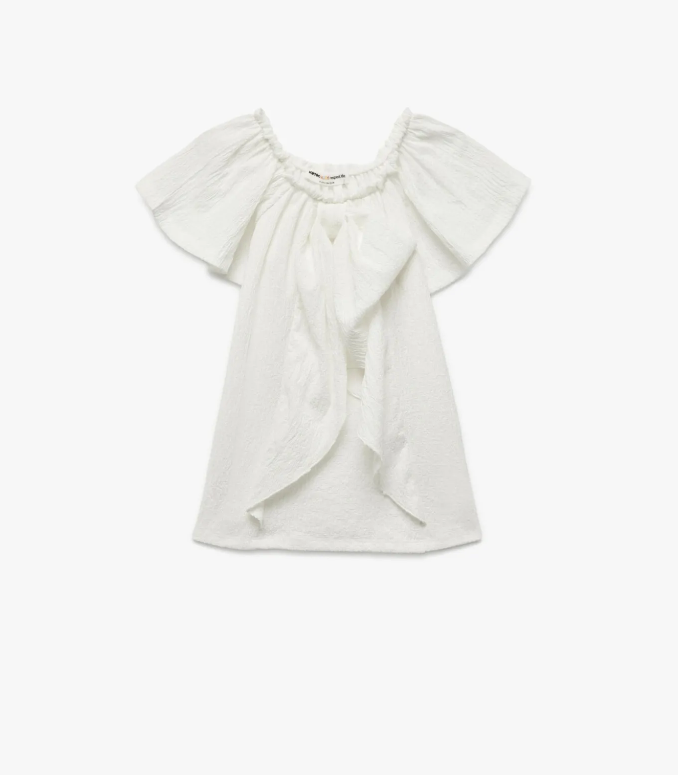 Crinkle fabric bow detail off shoulder ruffle short sleeve blouse.