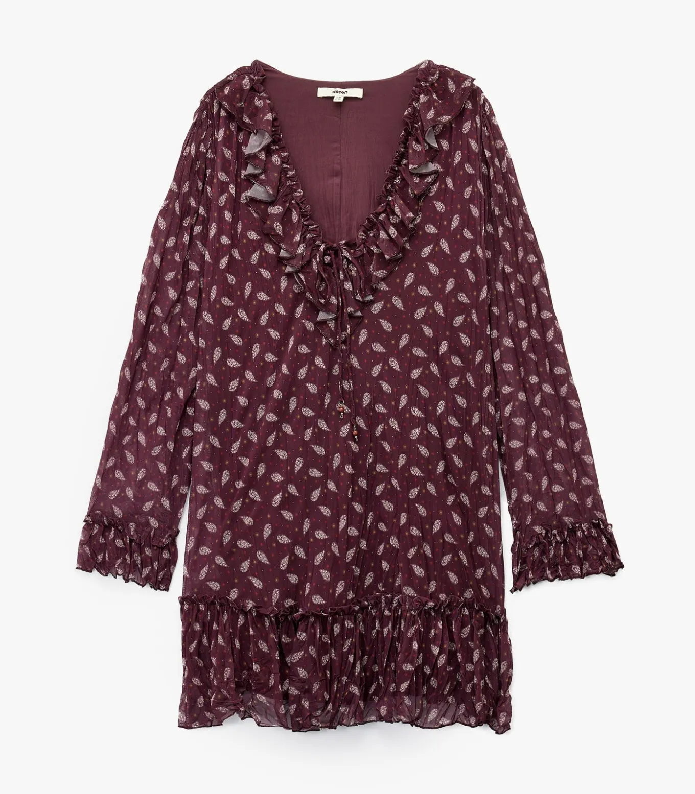 Koton Ethnic patterned ruffle detail long sleeve V neck mini dress.