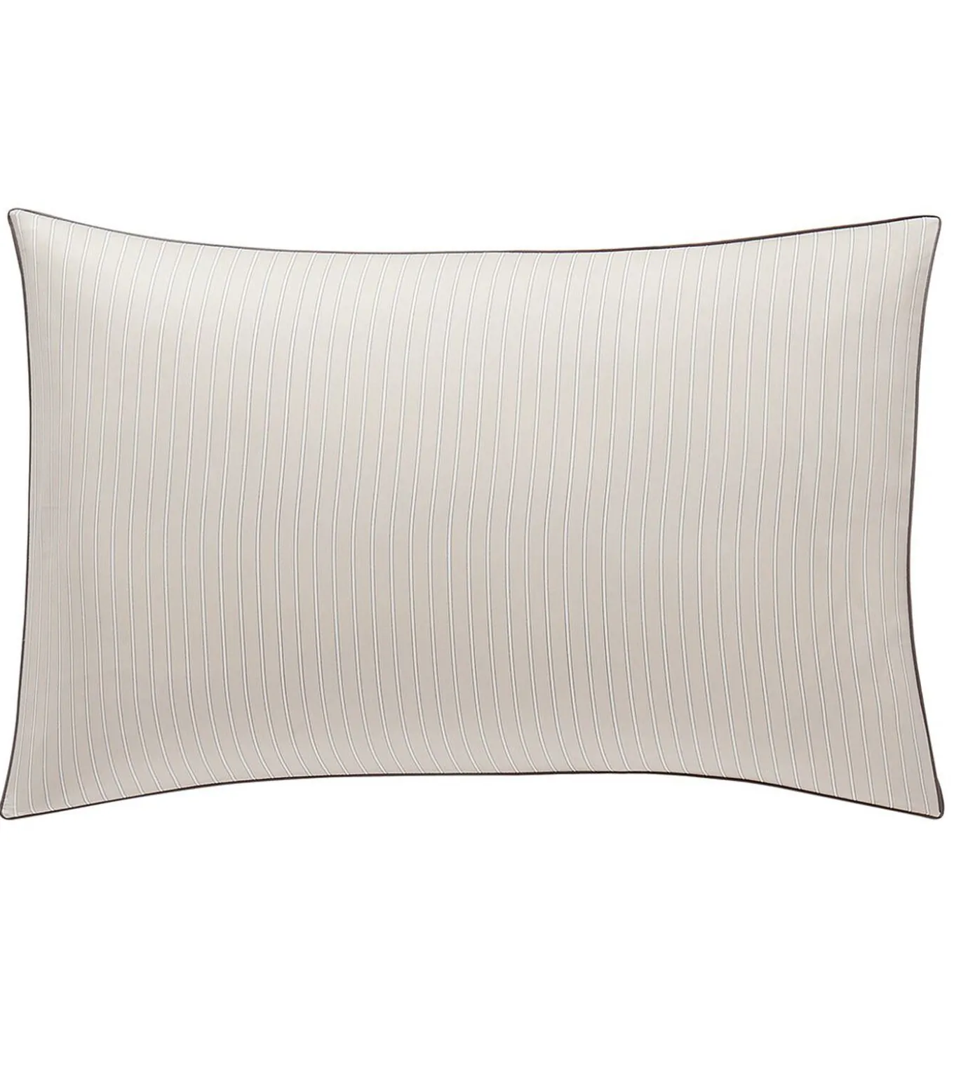 Voorzijde bedrukt met brede verticale strepen op een grègekleurige achtergrond.Keerzijde bedrukt met fijne verticale strepen op een grègekleurige achtergrond.Omkeerbare kussensloop met dubbele overslag.Afgewerkt met een grijze paspel.