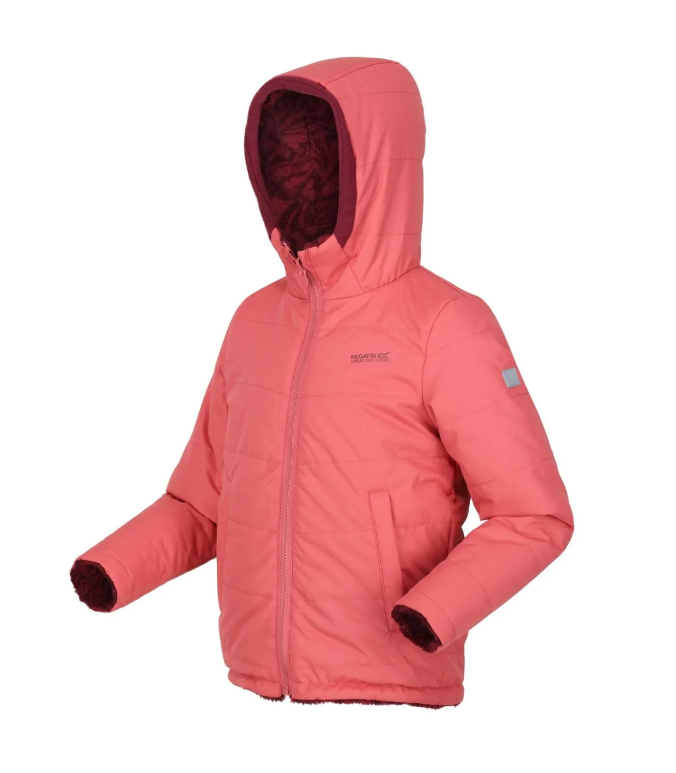 Deze productomschrijving betreft een omkeerbaar kinderjack van Regatta. De jas heeft een zebraprint en is gemaakt van 100% polyester materialen. De buitenstof bestaat uit borg en fleece met een zachte touch. Het heeft logo’s en doorgestikte motieven naast de zebraprint. De stof weegt 200 gsm. Technische aspecten van de stof zijn een DWR–afwerking om water tegen te houden, isolerende eigenschappen, snelle droogtijd, thermo–guard temperatuurregulatie en waterafstotendheid. De hals heeft een capuchon. De mouwen zijn lang. Extra functies zijn wattering, reflecterende afwerking en omkeerbaarheid zodat je twee stijlen kunt dragen. De capuchon zelf is vastgemaakt met elastische boorden. Voor het opbergen zijn er twee zijzakken en twee onderzakken. De rits sluit over de hele lengte.