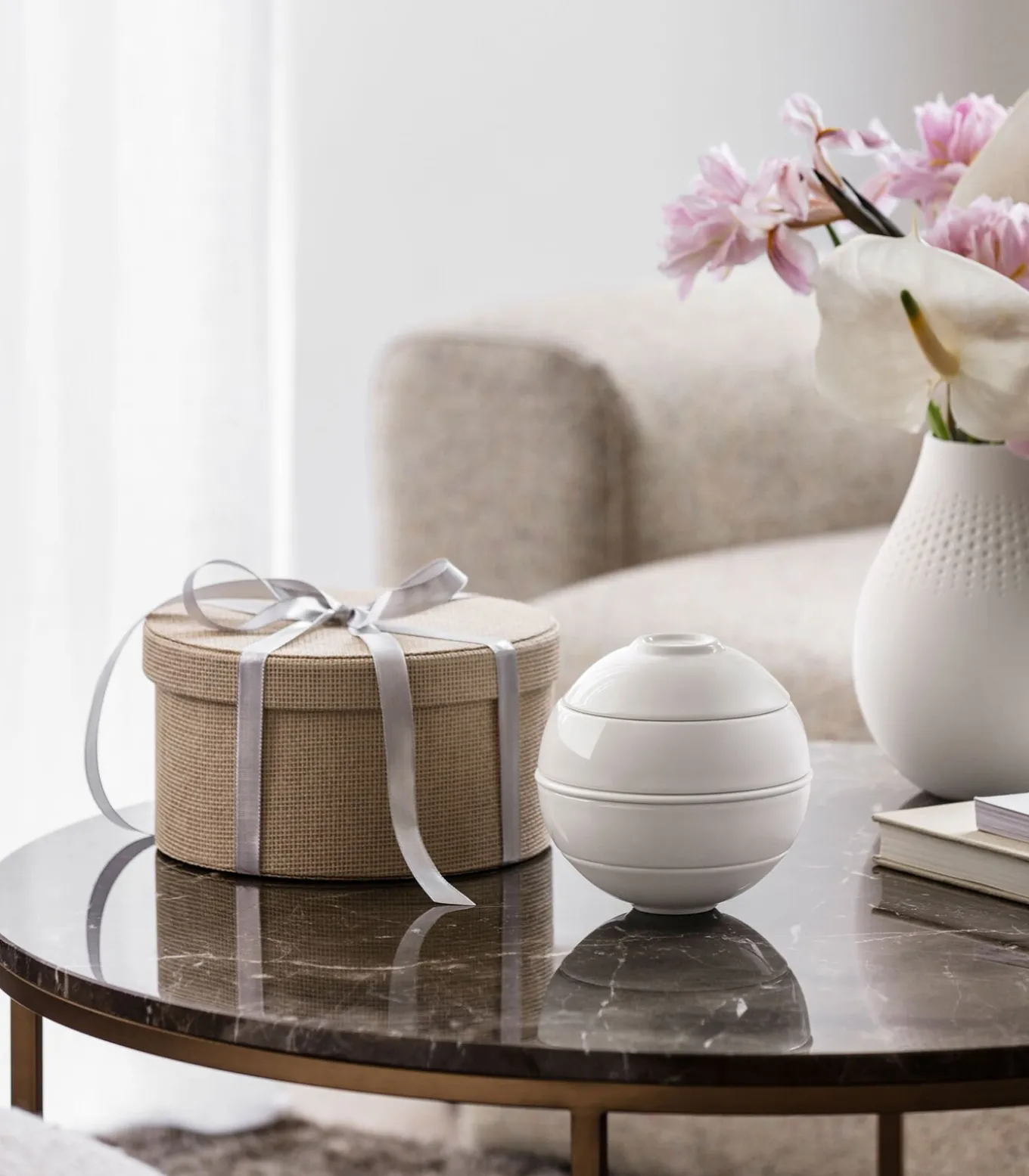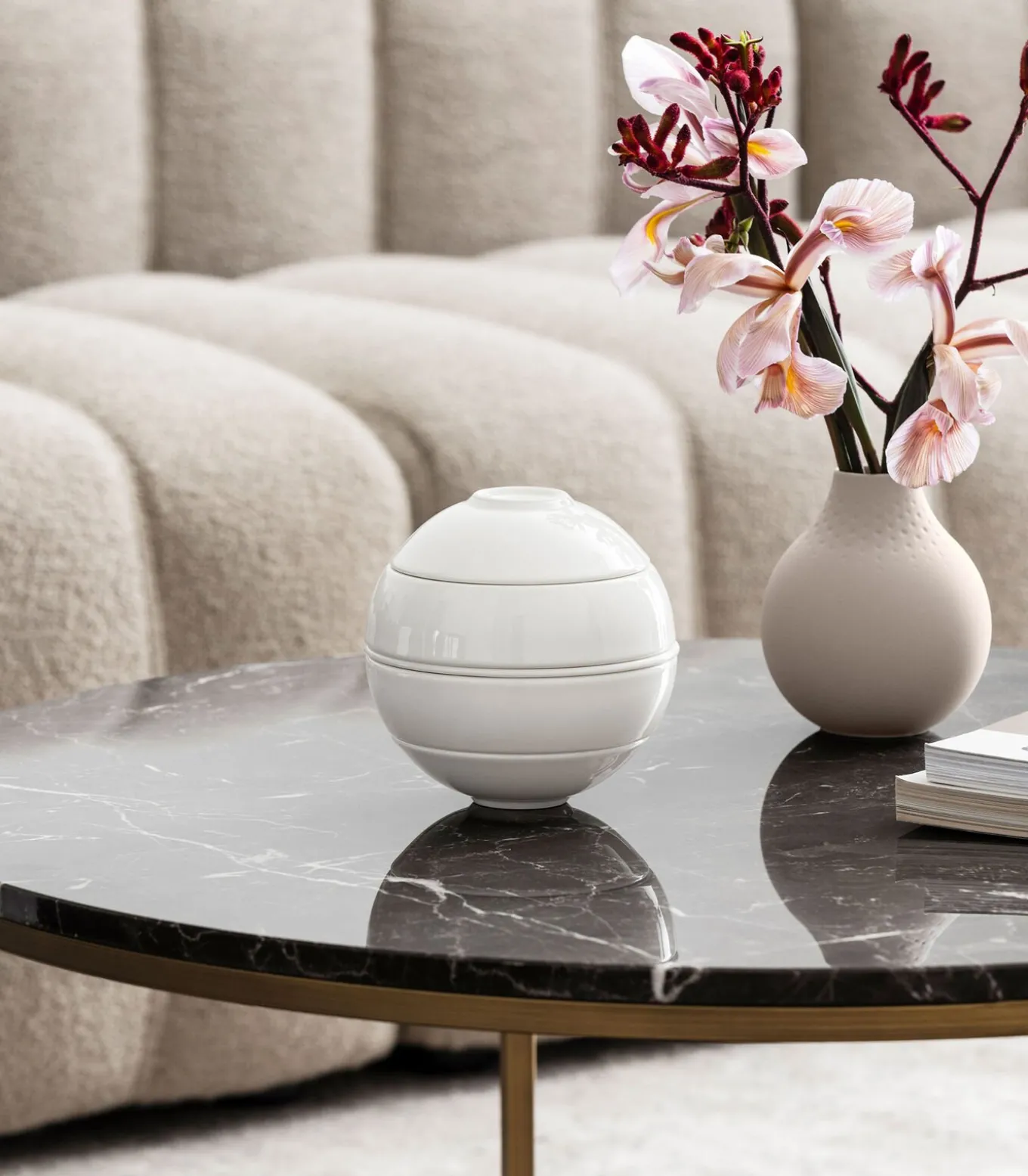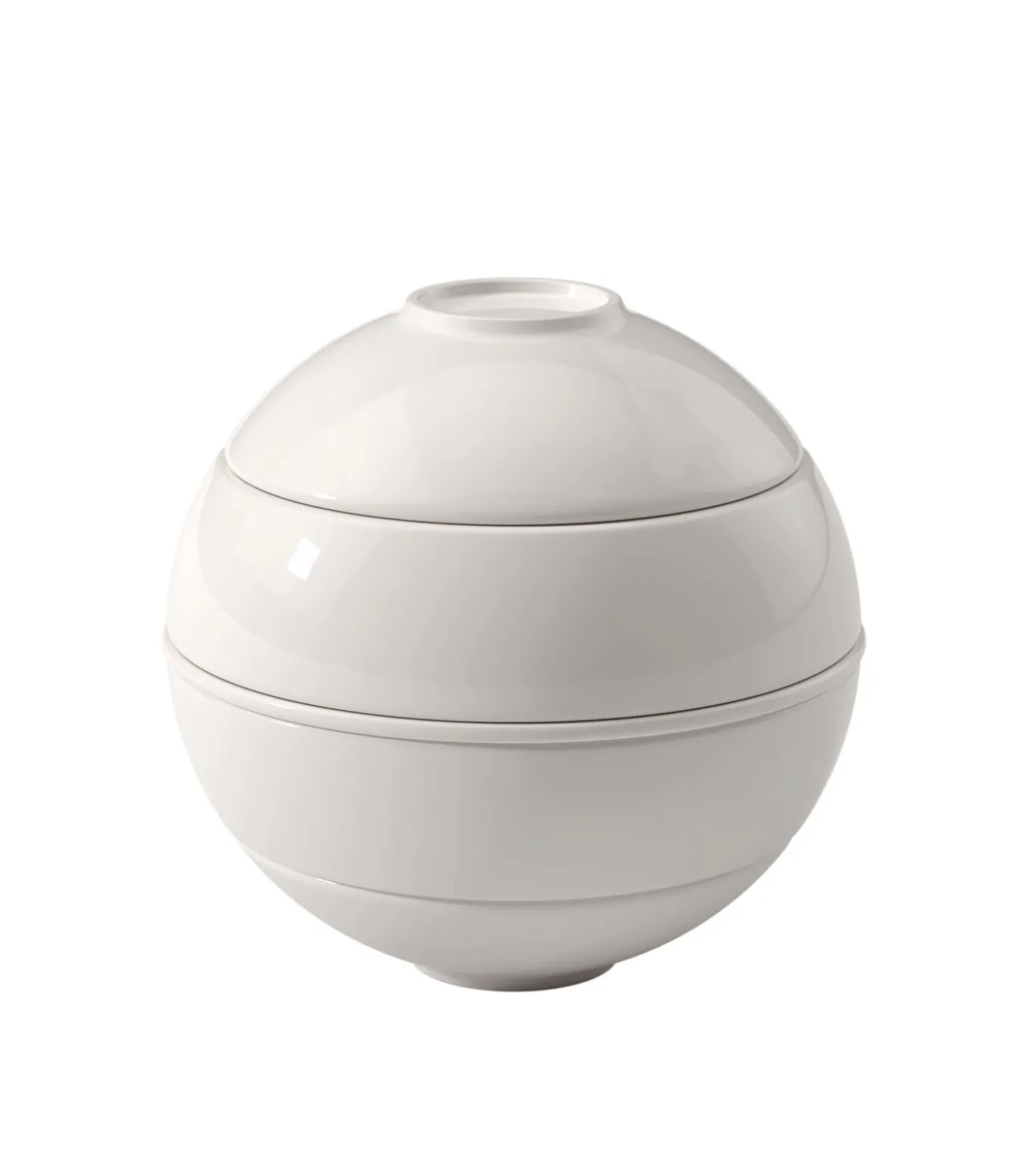 La Boule is een designobject dat al diep geworteld is in het DNA van Villeroy & Boch en combineert de kracht van het merk V&B met keramische knowhow en iconisch design. We zetten het succesverhaal met een “Iconic Family” voort: La petite Boule is de kleinere versie van onze topsellers La Boule memphis, black&white, white and black en Toy’s Delight. Als tegenhanger van La Boule, dat dineren en interieur combineert, combineert de kleine versie snacken en interieur. La petite Boule white is niet alleen een prachtig verzamelobject, maar ook de perfecte keuze voor fijnproevers die op zoek zijn naar een ideaal cadeau voor verschillende gelegenheden. Deze geraffineerde creatie combineert eersteklas functionaliteit met een iconisch ontwerp en trekt niet alleen alle blikken naar zich toe aan de eettafel, maar wordt ook een absoluut highlight in elke stijlvolle inrichting. Het bijzondere aan deze serviesset is de moeiteloze transformatie tot een artistieke bol. Hij bestaat uit vijf onderdelen, vier kommen en een middenbord, en is gemaakt van hoogwaardig porselein in Duitsland. La petite Boule white belichaamt tijdloze elegantie en eersteklas kwaliteit. Verzeker u nu van de innovatieve snackset! Geschikt voor de vaatwasser en magnetron