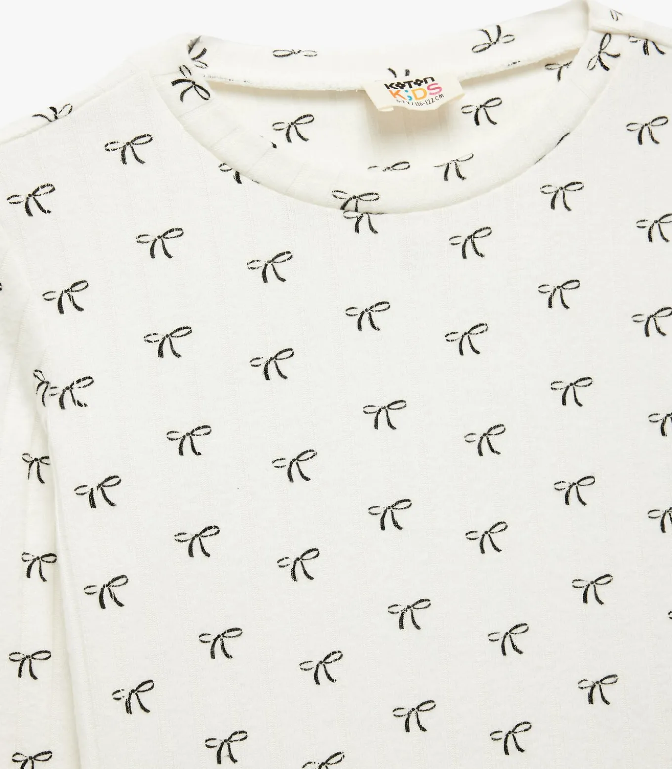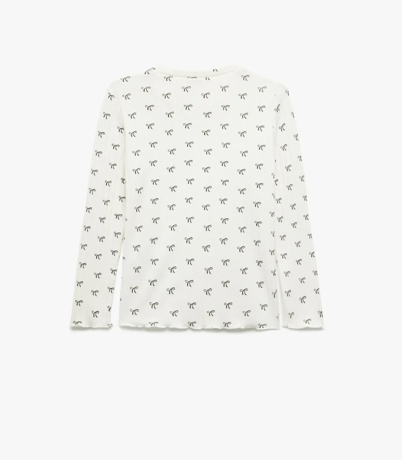Dit charmante T–shirt voor meisjes, met lange mouwen en een ronde hals, is versierd met een speels strikpatroon. Het is ontworpen voor dagelijks comfort en voegt een schattig detail toe aan elke outfit. Perfect voor zowel school als ontspanning.