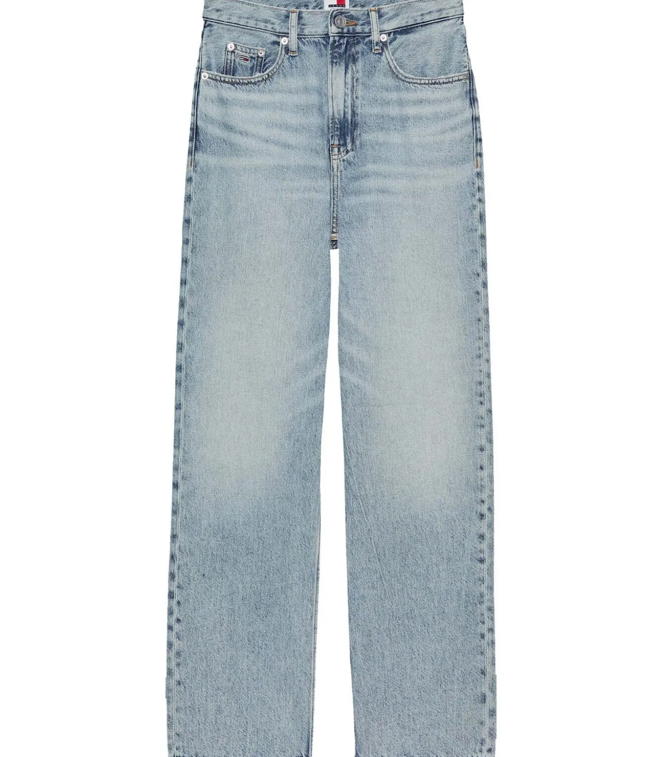 Kleur: Licht denim Samenstelling: 82% katoen, 18% lyocell Lengte: Lang Pasvorm: Slim fit Details: Five–pocket jeans met hoge taille en rechte pijpen, fades en whiskers aan de voorkant, afgewerkt met Tommy Jeans–vlagpatch op de muntzakken en achterkant Gebruik: Ideaal voor casual outfits met een retrogevoel, gemakkelijk te combineren met t–shirts of overhemden voor een altijd actuele look