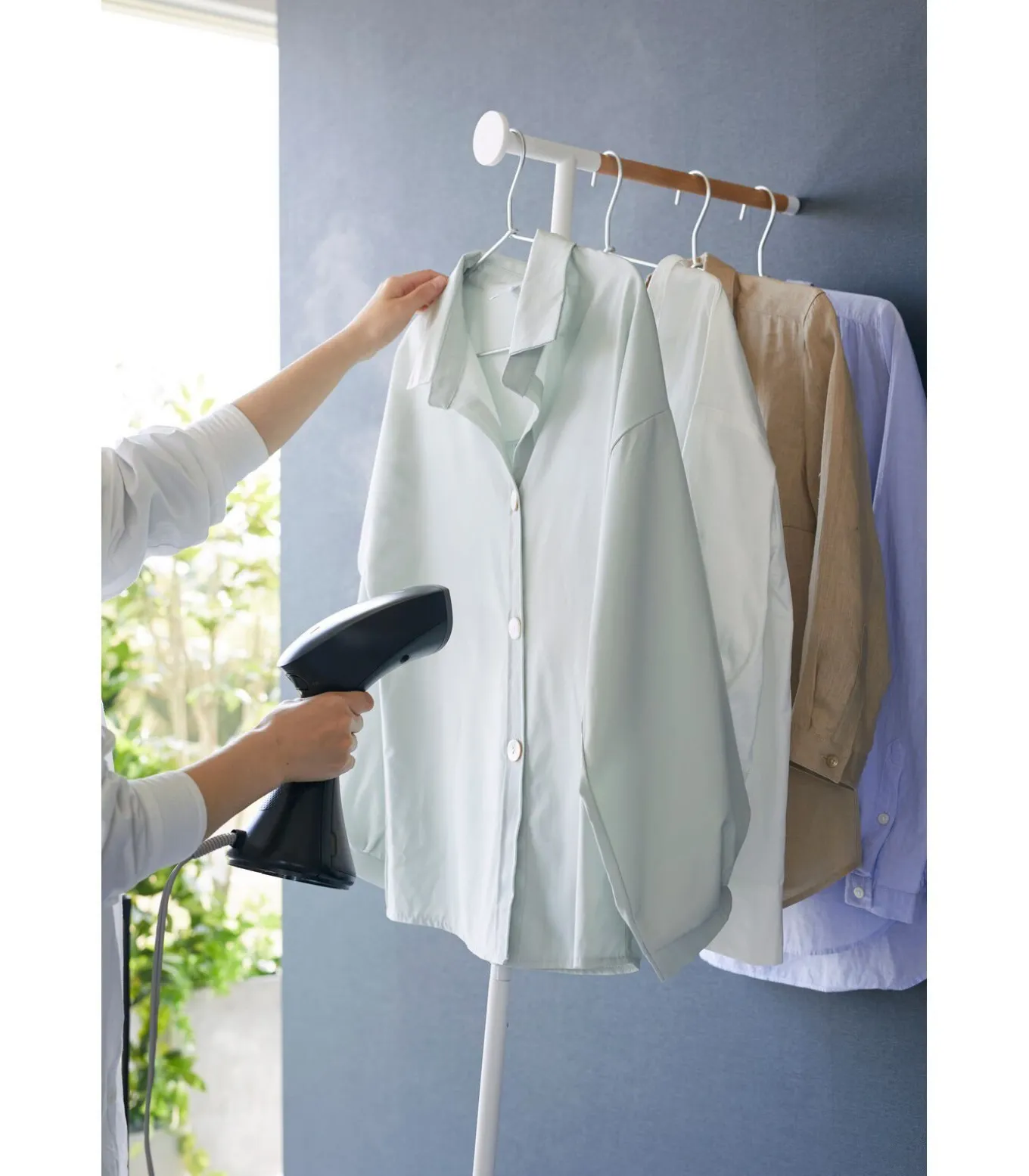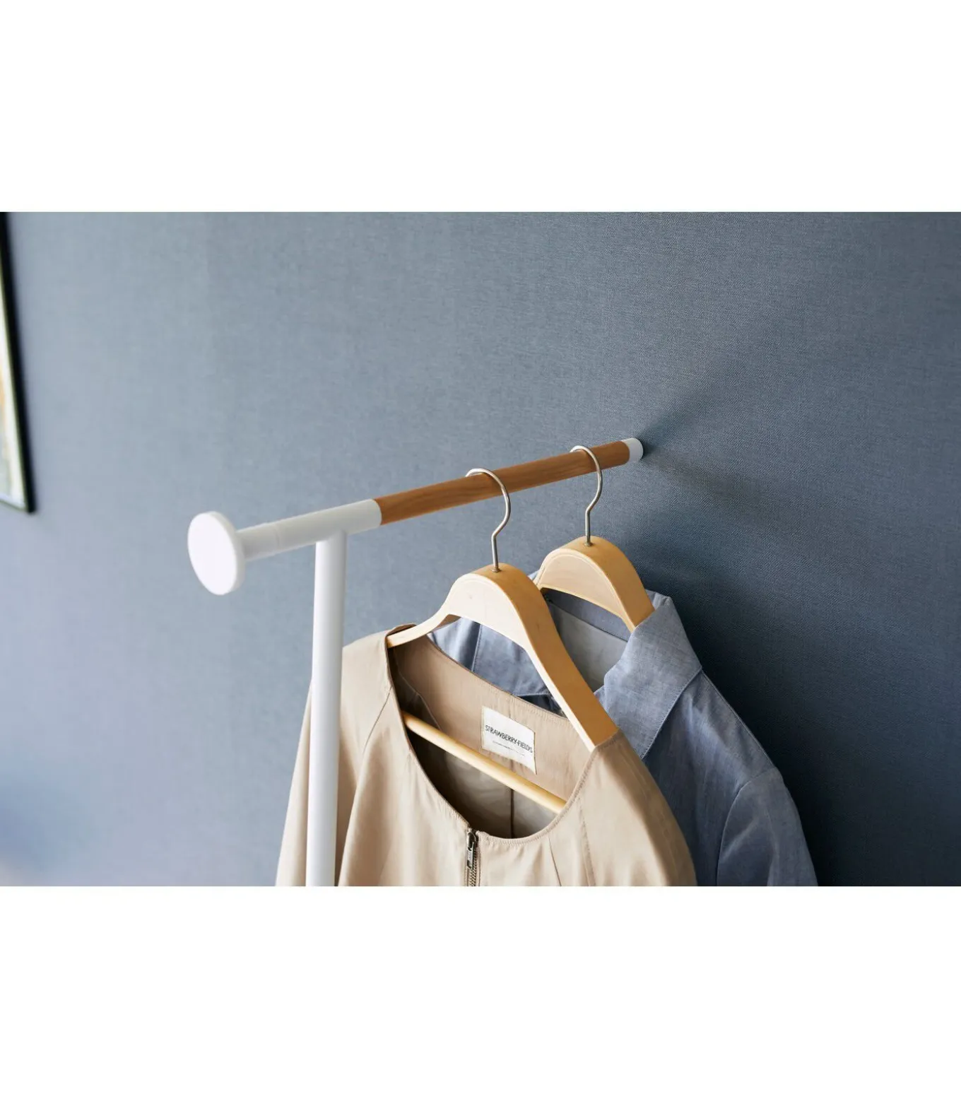 Dit rek van Yamazaki biedt voldoende ruimte voor het ophangen van jassen en andere kledingstukken. Na het ophangen kunnen de kledingstukken eenvoudig gestoomd worden om kreukels te verwijderen. Het rek leunt tegen de muur en vereist geen vaste installatie, waardoor het gemakkelijk te plaatsen is.