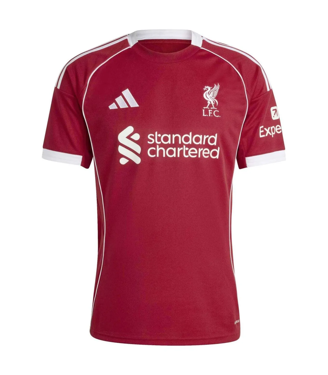 Kleur: Aardbeirood. Samenstelling: 100% gerecycled polyester. Mouwen: Kort. Halslijn: Ronde hals. Pasvorm: Slim Fit. Details: Liverpool FC–logo geborduurd op de borst, contrasterende witte inzetstukken, ademende Aeroready–technologie. Duurzaamheid: Volledig gemaakt van gerecycled polyester om afval en het gebruik van niet–hernieuwbare grondstoffen te verminderen. Gebruik: Officieel Liverpool FC 25/26 thuisshirt, ontworpen voor ondersteuning en vrije tijd.